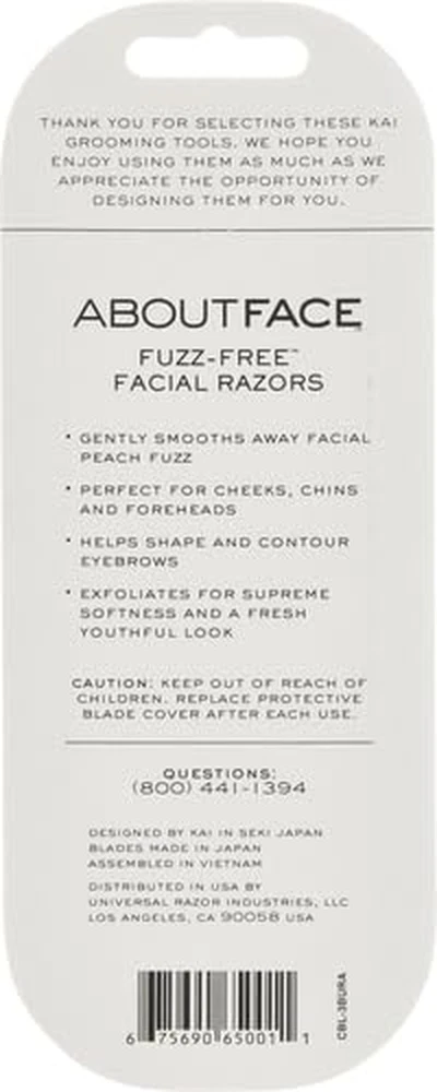 GENTLE FACIAL RAZORS: Gently remove facial hair for softer, smoother skin with About Face Fuzz-Free Facial Razors. Designed for women, these beauty razors shave unwanted peach fuzz. DISPOSABLE DERMAPLANING TOOL: Experience smoother and brighter skin after dermaplaning with the Fuzz-Free Razor. Our exfoliating tool gently and effectively scrapes off dead skin and fine facial hair for a fresh and glowing face. SALON QUALITY AT HOME: Skip a trip to the salon and experience quality results at home with About Face facial blades. Minimize uneven skin tone and ease dry patches for a premium skincare routine without the premium price. PERFECT FOR ON THE GO: Slim, compact face shaver stores easily in your purse, makeup bag, briefcase or carry-on for portable convenience. Remove unwanted hair anytime, anywhere with our travel razor. MADE IN JAPAN: Crafted from high-quality, Japanese steel, our facial razors for women can be used as eyebrow shavers, dermaplaning tools or gentle face razors. Included safety guards prevent cuts and irritation. Exfoliate, shave and smooth your face at home with the About Face Fuzz-Free Facial Razors. Made from premium Japanese steel, these facial blades offer salon results without the premium price for an elevated skincare routine. Use to shave any unwanted facial hair or peach fuzz on your cheeks, sideburns, chin and neck, or use as an eyebrow shaper to groom unruly brows. Includes 3 face razors and a safety guard to prevent cuts and irritation, so you can experience glowing, fresh skin without nicks or bumps. Ease dry patches, minimize uneven skin tone and promote a higher rate of skin cell turnover with Fuzz-Free Facial Razors. Suitable for all skin types and both fine or coarse hair, these beauty groomers are ideal for shaping, grooming and exfoliating. At Kai USA, we're on a mission to provide our customers with the best experience, offering high-quality products, state-of-the-art technology and a dedication to innovation.