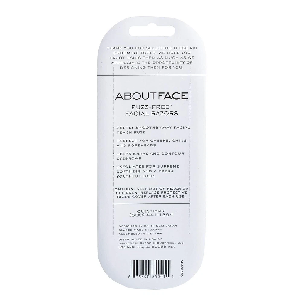 About Face Fuzz-Free Facial Razors for Shaving & Exfoliating - Includes 3 Beauty Groomers - For Face, Lips & Eyebrows Product Details Product Dimensions : 0.25 x 3.13 x 7.88 inches; 1.13 ounces Item model number : NC65039 Manufacturer : Universal Razor Industries Div of Kai-USA Brand: About Face Number of Blades: 3 Unit Count: 3 Count Special Feature: Travel-Size Skin Type: All GENTLE FACIAL RAZORS: Gently remove facial hair for softer, smoother skin with About Face Fuzz-Free Facial Razors. Designed for women, these beauty razors shave unwanted peach fuzz. DISPOSABLE DERMAPLANING TOOL: Experience smoother and brighter skin after dermaplaning with the Fuzz-Free Razor. Our exfoliating tool gently and effectively scrapes off dead skin and fine facial hair for a fresh and glowing face. SALON QUALITY AT HOME: Skip a trip to the salon and experience quality results at home with About Face facial blades. Minimize uneven skin tone and ease dry patches for a premium skincare routine without the premium price. PERFECT FOR ON THE GO: Slim, compact face shaver stores easily in your purse, makeup bag, briefcase or carry-on for portable convenience. Remove unwanted hair anytime, anywhere with our travel razor. MADE IN JAPAN: Crafted from high-quality, Japanese steel, our facial razors for women can be used as eyebrow shavers, dermaplaning tools or gentle face razors. Included safety guards prevent cuts and irritation. Exfoliate, shave and smooth your face at home with the About Face Fuzz-Free Facial Razors. Made from premium Japanese steel, these facial blades offer salon results without the premium price for an elevated skincare routine. Use to shave any unwanted facial hair or peach fuzz on your cheeks, sideburns, chin and neck, or use as an eyebrow shaper to groom unruly brows. Includes 3 face razors and a safety guard to prevent cuts and irritation, so you can experience glowing, fresh skin without nicks or bumps. Ease dry patches, minimize uneven skin tone and promote a higher rate of skin cell turnover with Fuzz-Free Facial Razors. Suitable for all skin types and both fine or coarse hair, these beauty groomers are ideal for shaping, grooming and exfoliating. At Kai USA, we're on a mission to provide our customers with the best experience, offering high-quality products, state-of-the-art technology and a dedication to innovation.