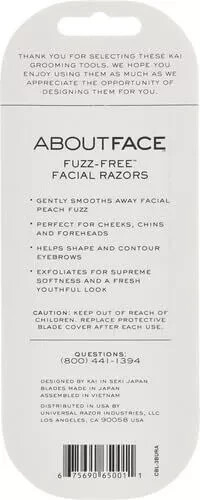 About this item GENTLE FACIAL RAZORS: Gently remove facial hair for softer, smoother skin with About Face Fuzz-Free Facial Razors. Designed for women, these beauty razors shave unwanted peach fuzz. DISPOSABLE DERMAPLANING TOOL: Experience smoother and brighter skin after dermaplaning with the Fuzz-Free Razor. Our exfoliating tool gently and effectively scrapes off dead skin and fine facial hair for a fresh and glowing face. SALON QUALITY AT HOME: Skip a trip to the salon and experience quality results at home with About Face facial blades. Minimize uneven skin tone and ease dry patches for a premium skincare routine without the premium price. PERFECT FOR ON THE GO: Slim, compact face shaver stores easily in your purse, makeup bag, briefcase or carry-on for portable convenience. Remove unwanted hair anytime, anywhere with our travel razor. MADE IN JAPAN: Crafted from high-quality, Japanese steel, our facial razors for women can be used as eyebrow shavers, dermaplaning tools or gentle face razors. Included safety guards prevent cuts and irritation.