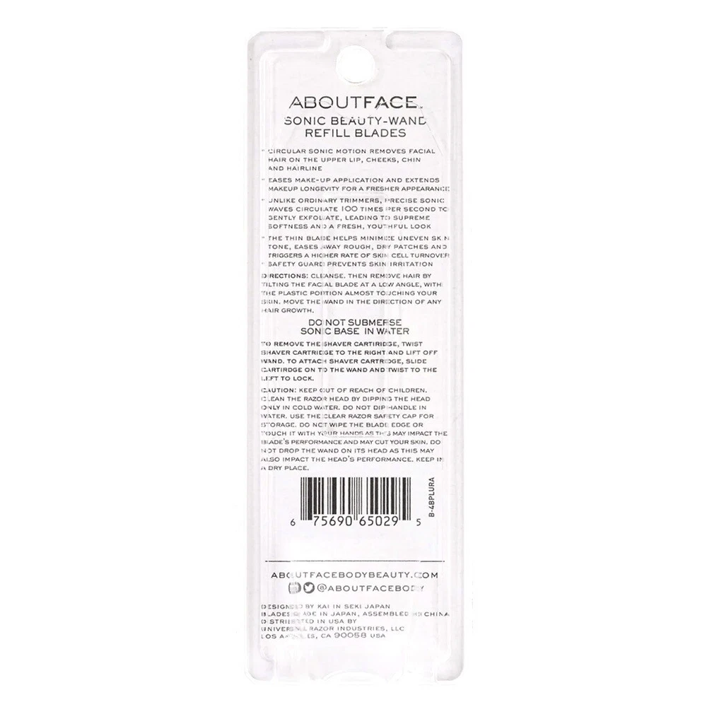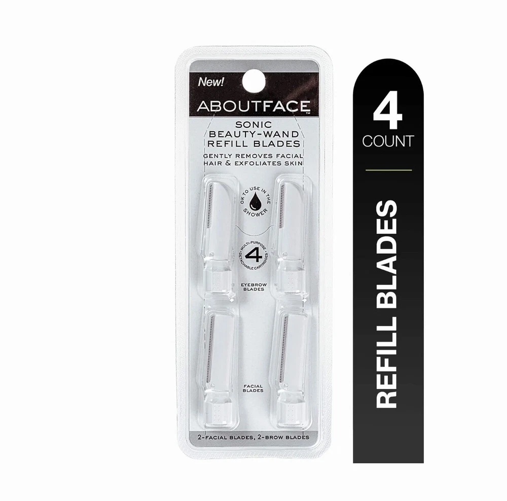 About Face Sonic Beauty-Wand Refill Blades for Facial Hair Removal & Exfoliating Skin - 4 Pack Product Details: Includes 4 blades (2 Eyebrow blades & 2 Facial Blades) Removes hair on Upper Lip, Cheeks, Chin and Hairline Please see all pictures for more details on the product. **No International Shipping Available. SHIPPING TO BE PAID BY BUYER and SHIPPED TO DOMESTIC LOCATIONS ONLY ** *Returns accepted within 30 days of purchase. Any Returns should be returned in the same condition as originally photographed and shipped.*