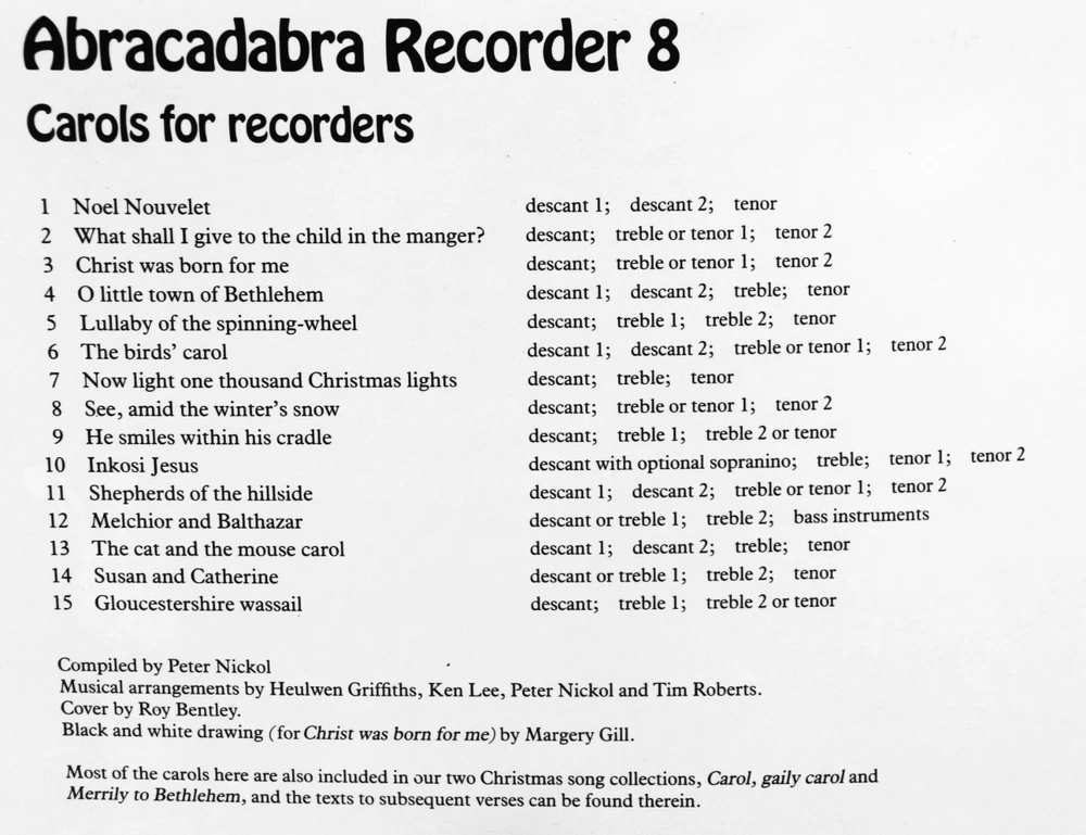 Abracadabra recorder carols for recorder. Book8 in recorder series. Can be used as top line solo or with various other parts.