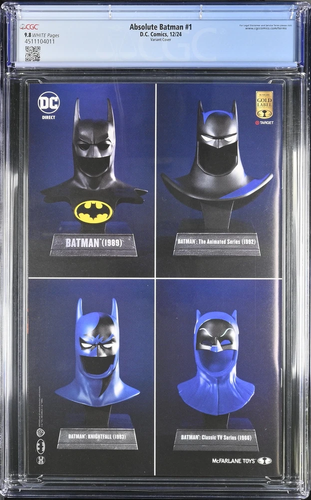 Welcome comic book community to the Destroyer of Worlds Comics store and our listing for Absolute Batman 1 CGC 9.8 Variant Cover We are a small shop and our focus is to bring the best buying experience to our customers. Destroyer of Worlds Comics is an authorized CGC Dealer which grants us access to the CGC database for all graded book details which are included in every listing along with the hi resolution scans taken by CGC. We know that buying comics online can be stressful so we proactively eliminate the most common sources of stress by packing our comics professionally using BCW Graded Comic Bags and then placing them into sturdy 200 lb test boxes to withstand any mishandling while in transit with the carrier. When we receive an order it becomes top priority and your order is immediately pulled from inventory and packaged properly to arrive in your hands as quickly as possible. Our goal is for you to not worry about your order arriving late or guessing when it will be shipped. When you buy from our store you will also receive hassle free 30 day returns and we will cover the shipping cost back to us if you decide to make a return. We hope our commitment to protecting comics and servicing our customers provides a trustworthy and pleasant experience and thank you for considering us. The images in the listing are the actual item you will receive after purchasing. If you have any questions prior to making a decision please reach out and we will answer promptly. We are located in southern Florida not far from CGC and add new listings regularly so please take a look at our other listings if you are looking for CGC graded books and favorite us as a seller if you enjoyed buying from us. CGC Certification Info Title: Absolute Batman Issue: 1 Grading Company: CGC Grade: 9.8 CGC Cert #: 4511104011 Page Quality: WHITE Issue Date: 12/24 Issue Year: 2024 Publisher: D.C. Comics Variant: Variant Cover Grade Date: 11/19/2024 Grade Category: Modern Art Comments: Scott Snyder story Nick Dragotta art Jim Lee cover Total Graded By CGC: In 9.8: 6 Grader Notes: None CGC Census Report CGC Database Query Time: 2024-11-25T15:42:36.8989698-05:00 Mint 10.0: 0 Mint 9.9: 0 Near Mint/Mint 9.8: 6 Near Mint+ 9.6: 0 Near Mint 9.4: 0 Near Mint- 9.2: 0 Very Fine/Near Mint 9.0: 0 Very Fine+ 8.5: 0 Very Fine 8.0: 0 Very Fine- 7.5: 0 Fine/Very Fine 7.0: 0 Fine+ 6.5: 0 Fine 6.0: 0 Fine- 5.5: 0 Very Good/Fine 5.0: 0 Very Good+ 4.5: 0 Very Good 4.0: 0 Very Good- 3.5: 0 Good/Very Good 3.0: 0 Good+ 2.5: 0 Good 2.0: 0 Good- 1.8: 0 Fair/Good 1.5: 0 Fair 1.0: 0 Poor 0.5: 0 Case Condition We understand every collector has a unique set of standards when it comes to condition of the case and we often receive entire submissions with defects therefore we make every effort to note those conditions in the listing since they are often not visible in the scanned images. Nearly every case we receive from CGC has at least one of the following defects: grade on label not centered, label mounted crooked, newton rings, scuffing, scratches, case stress from the sealing process or inner well movement. To keep you informed before making a purchase decision we note major defects like cracks, newton rings, heavy scratches, and major scuffing in the listing but do not list the minor ones. If there are any flaws you dislike in particular please message us and we would be happy to review any of our listings and get back with you with every flaw we can find on the case. In the event the case arrives and is not to your satisfaction please reach out and we will offer to replace it if we have one available in better condition or a return can be opened at no cost within 30 days to receive a full refund. Pricing All fixed price listings are firm. We price our books at fair value according to recently sold listings but do realize prices fluctuate frequently when auctions are involved so we sometimes create auction listings for a chance at reduced prices for those who enjoy the thrill of the hunt. We also regularly run promotional coupon codes for volume discounts on orders of multiple fixed price listings so be sure to add listings to your watchlist and check back frequently. Shipping Policy Destroyer of Worlds Comics typically ships your items same day or next business day after payment is made. CGC graded comics are wrapped both vertically and horizontally in 5/16 inch bubble wrap and then placed into a 200 lb test corrugated box for protection. Ungraded comics are shipped in Gemini Comic Mailers. Combined shipping is offered for both domestic and international buyers. Please note for international orders any additional import fees duties taxes or customs charges are the sole responsibility of the buyer. These charges are determined by your country's customs office and we unfortunately have no influence over the amount charged or the duration of the assessment process due to the customs forms being automated. Please be aware that customs procedures and policies vary from country to country. If you have any concerns or questions regarding import fees duties or taxes we recommend contacting your local customs office before making a purchase. Return Policy Free returns available on all CGC graded books within 30 days of purchase.