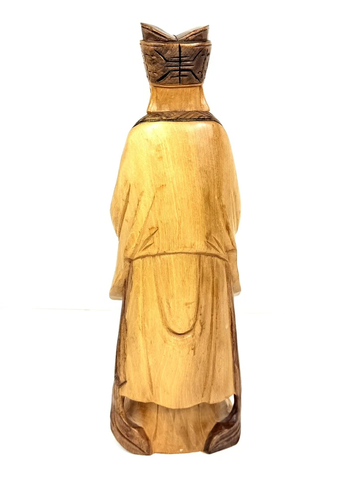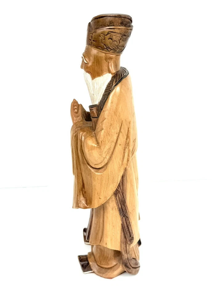 What an absolutely masterful piece of hand carved wood art! This figure of Kong Fuzi/Confucius is made from a solid piece of wood. I believe itβs olive wood, and the figure feels heavy for its size. There is an incredibly amount of detail put into the carving of the wood, especially into the face and beard. The figure is in good physical condition with only the slightest bit of surface wear. Has no cracks or breaks in the wood. Bubbling of red felt on bottom insisted with the age. Let me know if you have any questions. Blessings to you! π©Άπ€π©΅