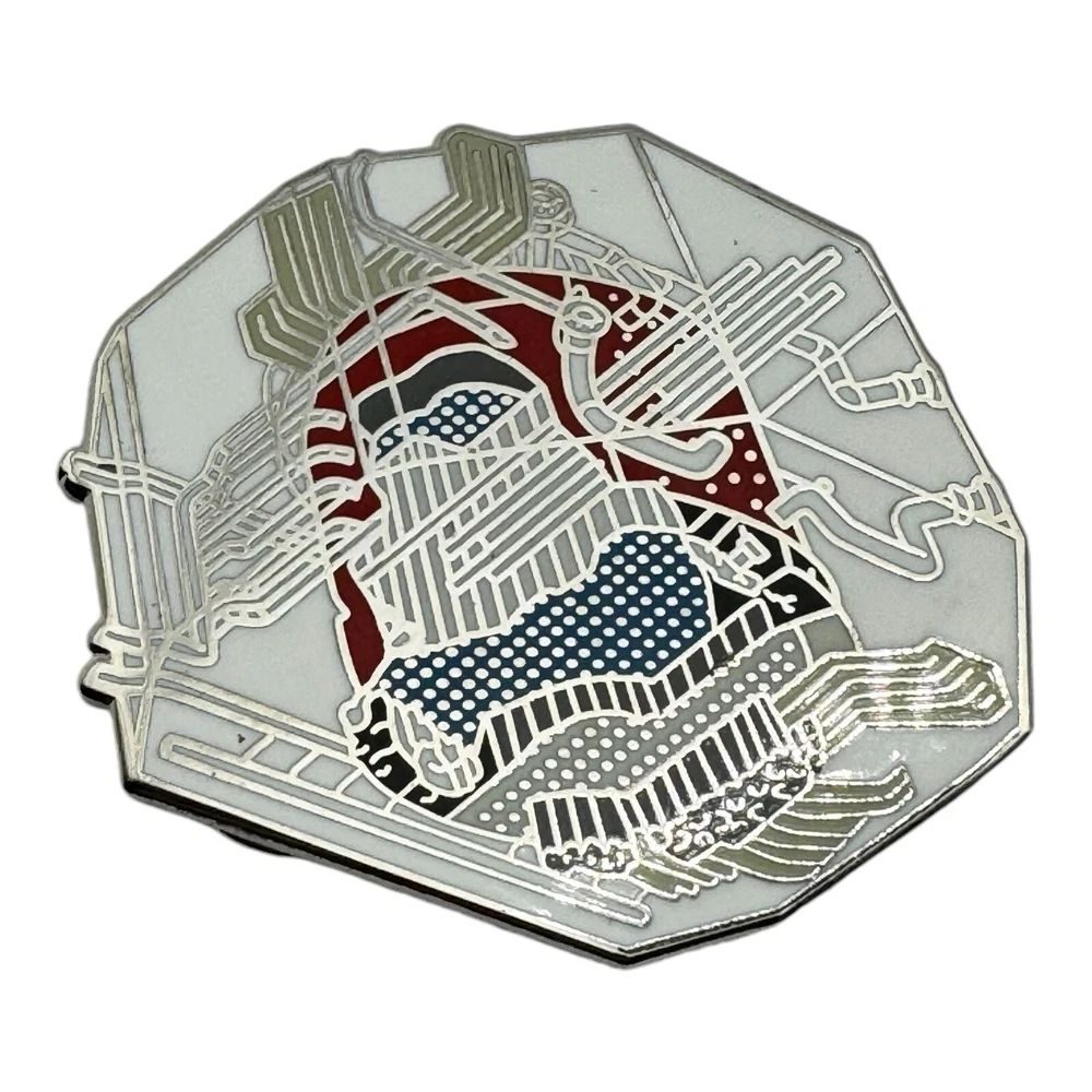 This unique 1.25-inch collectible pin features intricate line art with accents of red, blue, and white, creating a captivating abstract design. Perfect for art lovers and pin collectors alike, this piece is an excellent addition to any collection. • Size: 1.25 inches • Detailed abstract line art with striking colors • Sturdy clasp backing for secure wear • Collectible and unique design