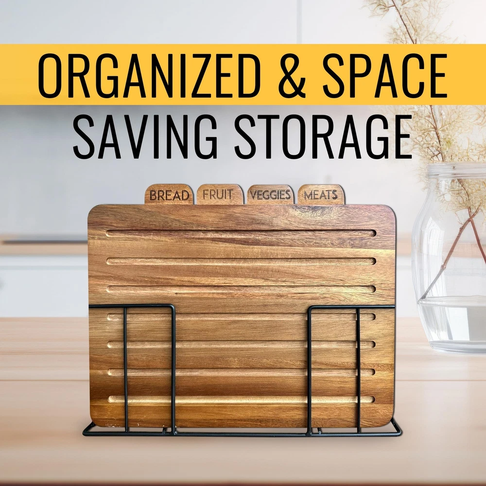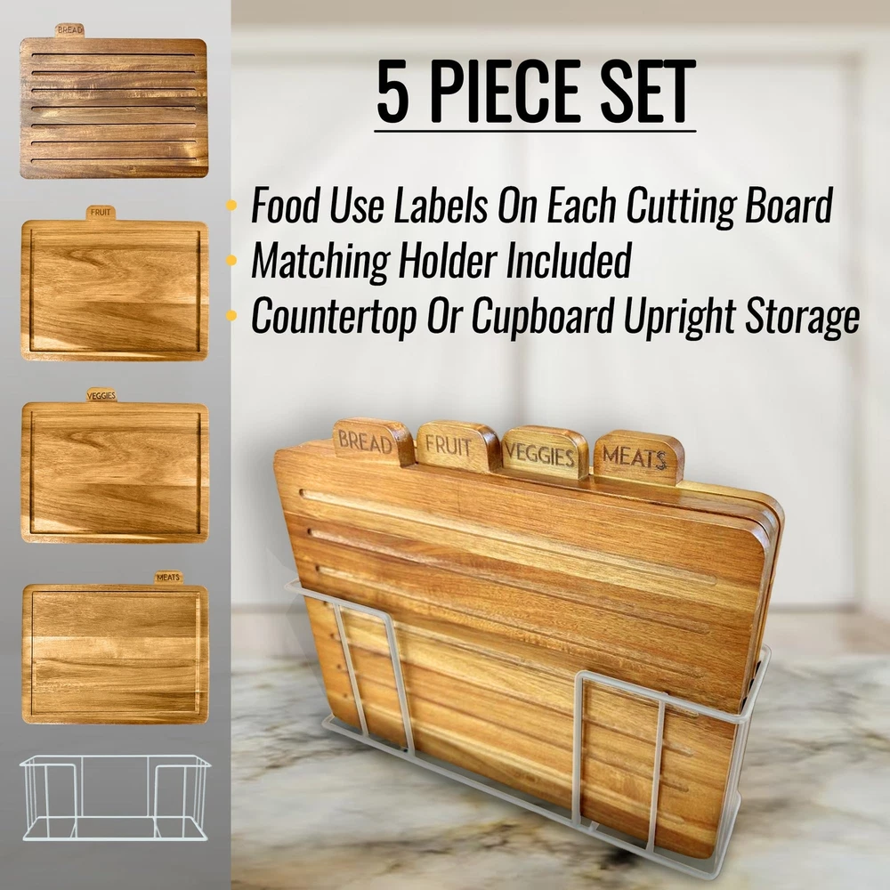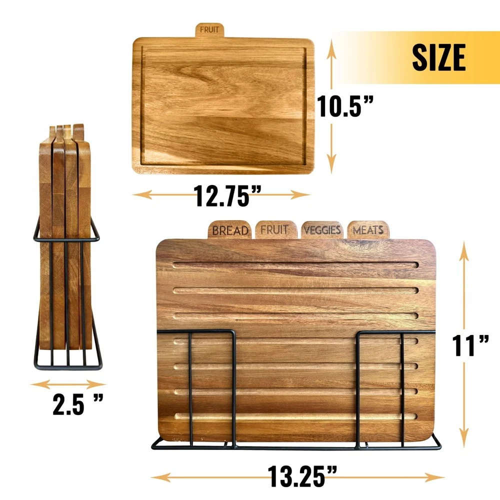 Description Introducing the Acacia Cutting Board Set of 4, the epitome of luxurious functionality for your kitchen. Crafted from durable acacia wood, this set not only provides a sturdy surface for all your cutting needs but also adds a touch of elegance to your kitchen decor. Each wooden chopping block in the set is generously sized, making them perfect for tackling big cutting tasks. Whether you're chopping vegetables for a salad or slicing meat for dinner, these boards offer ample space for all your culinary preparations. Delight your loved ones by gifting them with our premium must have chopping boards!!! Best as a present for a wedding registry, bridal shower, Christmas, Mother's Day, Father's Day, House warming gift, Birthday, Anniversary, or other special occassion! The standout feature of this set is the labeled tabs on each board. With distinct labels for fruit, meat, vegetables, and bread, you can ensure a clean cutting surface for each category of food. This smart feature ensures that your food preparation is not only efficient but also safe and hygienic. The set also comes with a stylish stand for storing and organizing the boards, making them a practical and attractive addition to your kitchen. With the Acacia Cutting Board Set of 4, you get a blend of style, convenience, and safety all in one package. It's a kitchen necessity! SAFE CHOPPING - Our non toxic acacia wood cutting boards come with smart organizer tabs labeled to separate your meat, bread, vegetable, and fish mats from each other; ensuring that your food stays 100% healthy. ORGANIZED STORAGE - Worried about cupboard clutter? With a stand built to store and organize these thin cutting boards on the counter, you'll never have to worry about searching through disorganized drawers and containers to find them. ECO-FRIENDLY - Have peace of mind when you chop with our new non plastic cutting boards made of real sustainable organic wood materials. These materials are biodegradable unlike plastic and don't hurt the environment. PREVENT MESSES - These dark cutting blocks come with a juice groove to keep all extra messes from spilling onto your countertop. Furthermore, the bread board has multiple grooves to collect large and small crumbs and keep your kitchen clean. EASY CLEANING - Because of their non absorbent surface and slick finish, this pack of cutting sheets is extremely easy to clean. Simply rinse with soap and water to clean the boards. These are not dishwasher safe and are best hand washed over sink. KEEP YOUR KNIVES SHARPER - These real wood grain cutting boards add an extra layer of cover between your knives and countertop, protecting your table and keeping your utensils sharp. MULTI-PURPOSE - Because of its simple, versatile design, each mat has multiple uses. It can be used as a butcher block for meat, a serving plate for fruit, a sheet for kneading dough, a charcuterie boards for cheese and crackers, a decorative center piece, and much more! BEAUTIFUL KITCHEN ACCESSORY - Compliment your kitchen with this aesthetic non-plastic wooden cutting board kit. Unlike a plastic cutting board, these wood ones have a natural look that accentuates any modern or rustic kitchen decor. GIVE THE PERFECT GIFT - With their unique organization features, storage rack, and solid design, this acacia cutting board set is sure to please any mom, dad, friend, home cook, chef, or culinary artist. TAKE EVERYWHERE - The board's flat, lightweight design makes them easy to handle, whether you're using them at a restaurant, party, camping, fishing, or cooking from home. Their solid, rigid structure makes them resistant to damages during travel.