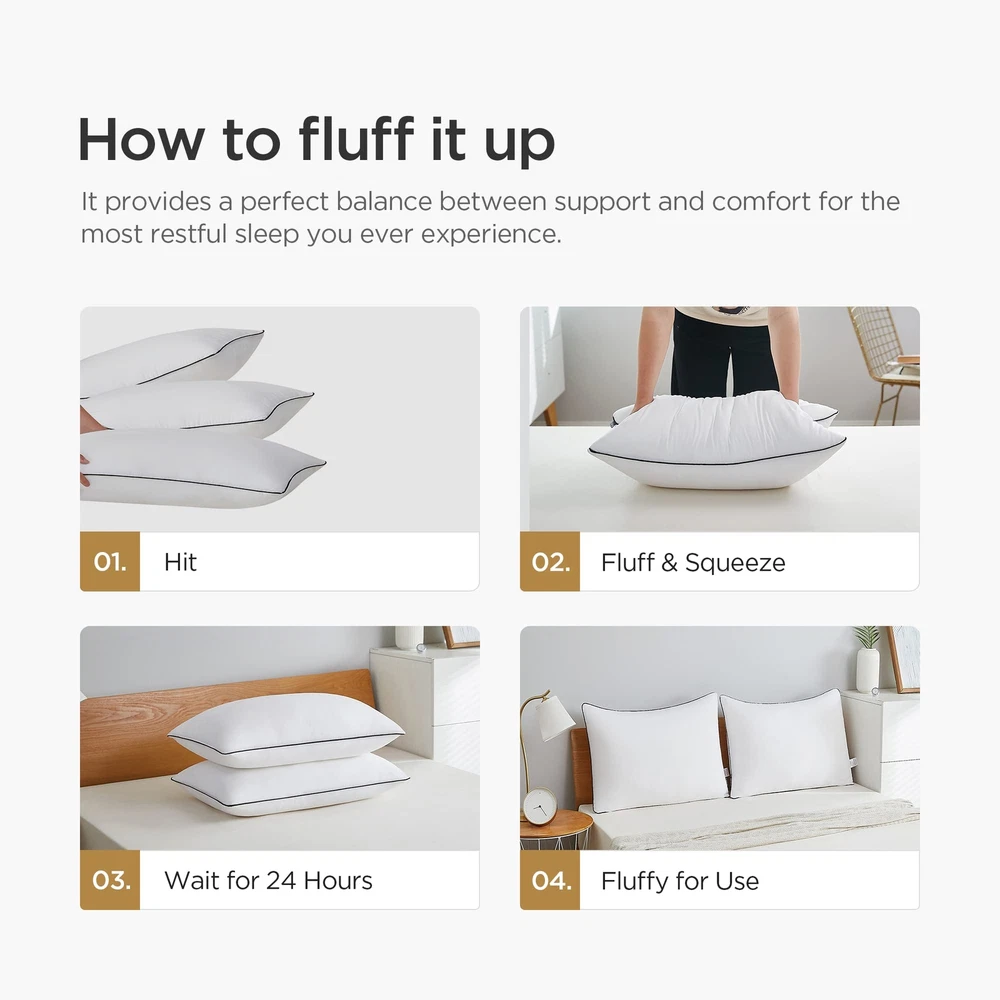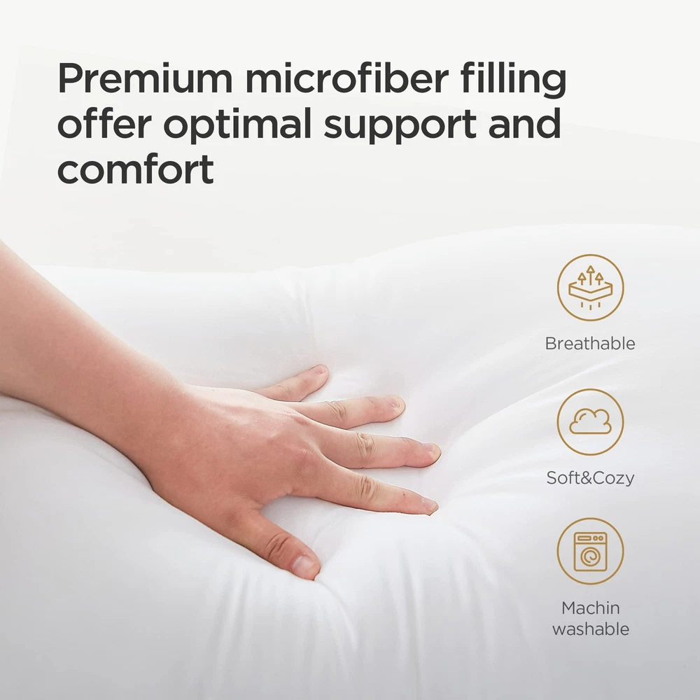 Enjoy cozy night sleep with Acanva bed pillows! Our fluffy, thick and supportive sleep pillows pop up quickly, offering the ultimate warmth and comfort. All materials are pure and clean to offer a sniffle-free night's sleep. Also ideal for guest bedroom, reading, setting up or decoration purpose. Package: Vacuum packaged NOTE: The pillow is compressed for better protection and easier shipping. Please open the package to allow it to expand into its original deep and fluffy shape. You could also put the pillow into the dryer in low heat for 10 minutes, to reach to maximum fluffiness. It will fit wonderfully into the pillow cases. Cooling Bed Pillows for Sleeping: The bed pillow cover is made of premium cotton polyester to stay soft, breathable, and dry. They are perfect for those who sweat easily or prefer a cool pillow to sleep with. Piping along the edge creates a neatly tailored look. Fluffy & Supportive: Filled with 100% microfiber similar to down which makes the pillows supportive and cozy. Whether you prefer soft or firm pillows, our comfortable pillows are for you. Enough filling makes pillows extremely fluffy. Our 4 pack bed pillows provide a great balance of supple softness and plump firmness. Comfort & Luxury at Home: With our bed pillows never go flat, no matter what kind of sleeping positions you prefer, including side and back sleepers, you can always get experience five-star hotel luxury and cozy at home every night. Packaging Design: The bed pillows are vacuum packed and rolled in a PE bag for shipping purposes. We suggest removing the vacuum bag, shaking it a few times to make it fluffy and putting them under sun bathing a few hours regularly for healthier use. Perfect Size: There are three sizes available, standard pillows 20x26 2/4pack, queen pillows 20x30 2/4 pack, king pillows 20x36 2/4 pack. The medium firm pillows down alternative filled is an ideal gift choice for your family and friends on Father's Day, Mother's Day, Birthday, Christmas, New Year, Housewarming or Back to School.