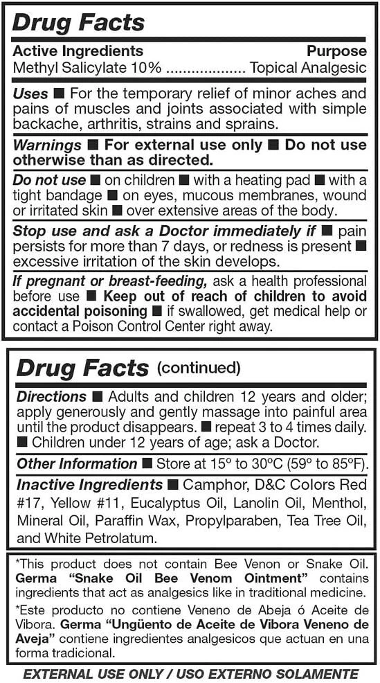 Best & Fast Relief Formula ! $6.65 ea. + Free S&H For the temporary relief of minor aches and pains of muscles and joints associated with simple backache, arthritis, strains and sprains. Ingredients: Methyl Salicylate, Eucaliptus Oil, Tee Tree Oil, Menthol, Camphor. Para el alivio temporal de dolores y dolores menores de músculos y articulaciones asociados con dolor de espalda simple, artritis, distensiones y esguinces. SHIPPING: When placing your order please double check your SHIP TO address. Add APT# if needed. Select PRIORITY METHOD for urgent orders. Otherwise please allow ample time for your package to arrive. Problems with your order ? MESSAGE US for faster service. FREE U.S. SHIPPING Usually arrives within 5 business days after shipped.