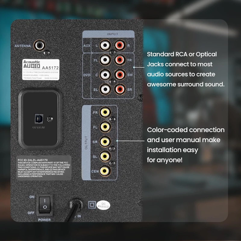 Acoustic Audio AA5170 5.1 Bluetooth Home Theater Speaker System Acoustic Audio AA5170 5.1 Bluetooth Home Theater Speaker System with Powered Subwoofer - 700W Brand: Acoustic Audio by Goldwood | Model: AA5170 | Power Output: 700 Watts Product Overview The Acoustic Audio AA5170 5.1 Bluetooth Home Theater Speaker System is designed to deliver exceptional audio quality for your home entertainment setup. With a powerful 700W output, this system features Bluetooth connectivity, a powered subwoofer, and a Pro Surround function for immersive sound. Enjoy seamless connectivity and high-quality sound for movies, music, gaming, and more. Key Features Bluetooth 5.1 Connectivity: Stream music directly from your phone or other Bluetooth-enabled devices. Pro Surround Function: Converts stereo sound into rich 5.1 surround sound for a cinematic audio experience. Multiple Input Options: Includes RCA, Digital/Optical, AUX inputs, USB drive, and SD card slots for versatile connectivity. High-Quality Audio: Powered subwoofer and 5 wired satellite speakers deliver deep bass and clear sound. Easy Plug and Play Setup: Simple to connect to any TV, gaming console, PC, or audio device with standard inputs. Full Function Remote: Convenient control over your system from anywhere in the room. FM Tuner: Listen to your favorite FM radio stations with the built-in FM tuner. System Specifications Feature Details Power Output 700 Watts Speaker Type 5 Satellite Speakers + 1 Powered Subwoofer Subwoofer Size 12.3" x 6.7" x 13.1" Satellite Speakers Size 6.7" x 4.1" x 4" each Frequency Response 20Hz - 20kHz Connectivity Bluetooth, RCA, AUX, Digital/Optical, USB, SD Card Compatibility TV, Laptop, PC, MP3, Gaming Consoles, Smartphones, Tablets Input Voltage 110V Dimensions (Subwoofer) 12.3" x 6.7" x 13.1" Dimensions (Satellite Speakers) 6.7" x 4.1" x 4" Weight 20 Pounds What’s Included 1 Powered Subwoofer Speaker 5 Passive Wired Satellite Speakers Full Function Remote Control Digital/Optical Cable RCA to RCA Cable RCA Antenna Cable 3.5mm to RCA Cable Instruction Manual System Requirements Standard 110V US Grounded Wall Plug Compatible with devices featuring 3.5mm headphone jack, Digital/Optical, RCA Stereo, or 6 Channel RCA Outputs. Compatible with TVs, home entertainment systems, laptops, PCs, DVD players, MP3 players, and gaming consoles. Why Choose the Acoustic Audio AA5170? Powerful 700W output for superior sound quality. Bluetooth capability for easy wireless streaming. Comprehensive compatibility with a wide range of devices. Pro Surround function for immersive 5.1 sound from any stereo source. Convenient remote control for easy operation. Built-in FM tuner for added functionality. Images Product Images: Conclusion Upgrade your home theater system with the Acoustic Audio AA5170 5.1 Bluetooth Speaker System. Featuring a powerful 700W output, easy connectivity, and immersive surround sound, this system is perfect for movies, music, gaming, and more. With a built-in FM tuner and Bluetooth streaming, it offers exceptional versatility. Enhance your entertainment experience today!
