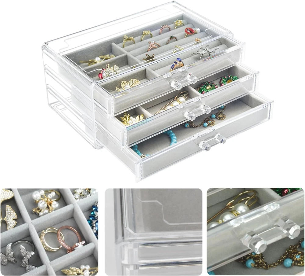 Acrylic Jewelry Box 3 Drawers, Velvet Jewellery Organizer, Earring Rings Gray Product Details Color: Gray Brand: Weiai Material: Plastic Style: Modern Special Feature: Jewelry Box with 3 Drawers Recommended Uses For Product: Earrings Rings Necklaces Bracelets Product Dimensions: 5.31"D x 9.25"W x 4.72"H Target Audience: Women Shape: Rectangular Occasion: Mother's Day, New Year, Birthday, Thanksgiving, Valentine's Day Mounting Type: surface mounted Finish Type: Polished Inner Material: Velvet Closure Type: Drawer Number of Drawers: 3 Item Weight: 2.4 Pounds Number of Compartments: 16 Number of Items: 1 Manufacturer: Chunze Part Number: 5841506875 Item Weight: 2.35 pounds Item model number: 5841506875 Is Discontinued By Manufacturer: No Finish: Polished Item Package Quantity: 1 Number Of Pieces: 1 Special Features: Jewelry Box with 3 Drawers Batteries Included?: No Batteries Required?: No Color: Gray Brand: Weiai Material: Plastic Style: Modern Special Feature: Jewelry Box with 3 Drawers Recommended Uses For Product: Earrings Rings Necklaces Bracelets Product Dimensions: 5.31"D x 9.25"W x 4.72"H Target Audience: Women Shape: Rectangular Occasion: Mother's Day, New Year, Birthday, Thanksgiving, Valentine's Day CLEAR DESIGN: Jewelry organizer is made with a crystal-clear material, the product's dimension: 9.25″ x 5.31″ x 4.72″ 3 DIFFERENT DRAWERS: The first layer is 7 slots and 3 compartments, the second has 6 compartments of different sizes, the third layer doesn't have any dividers. You can rearrange the drawers according to your needs. VELVET LINING: When you place your items inside of jewelry box, you’ll find that there's velvet lining inserts that work to keep the interior of the organizer free from scratches and damage DRAWER HANDLES: The molded handles are a breeze to grasp and pull that allow you to access your rings, earrings, necklaces, cufflinks, and brooches effortlessly ORDERLY STORAGE: Keeps clutter away on the vanity, counter top, dresser, work desk by keeping everything in one place. Keep your jewelry clean all the time