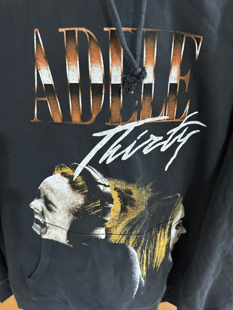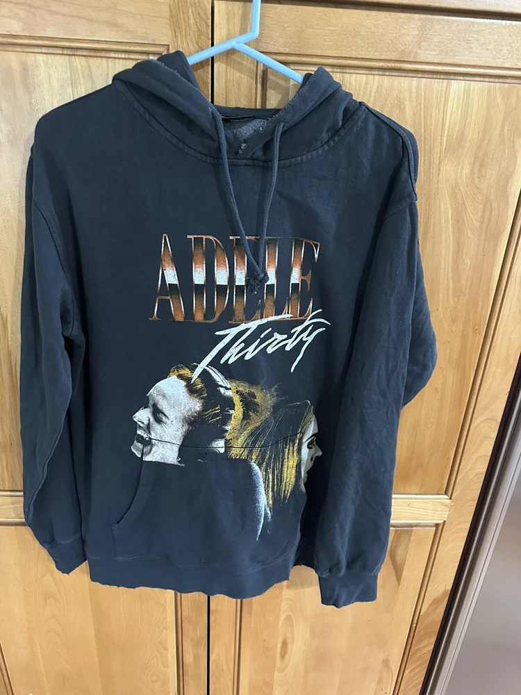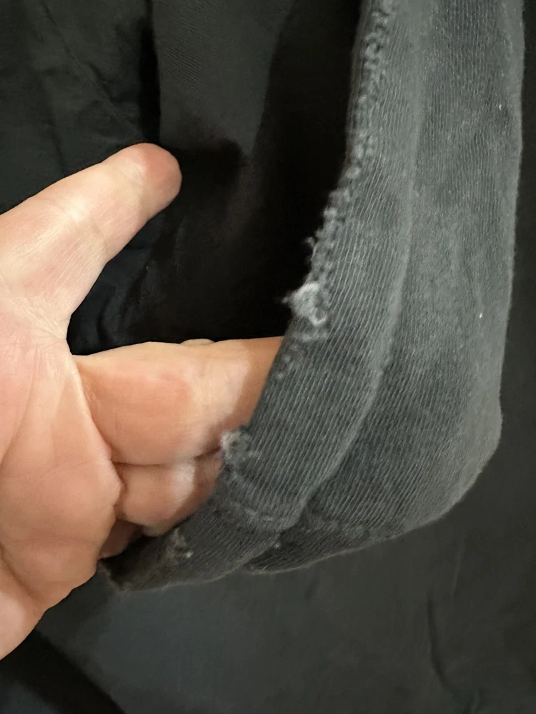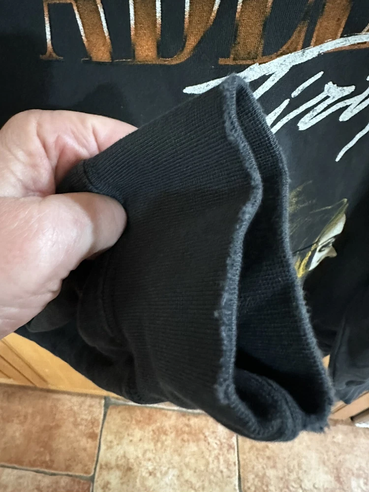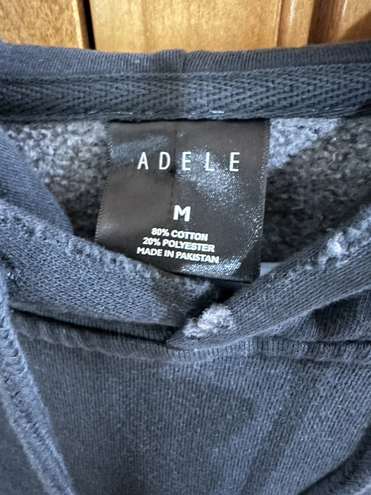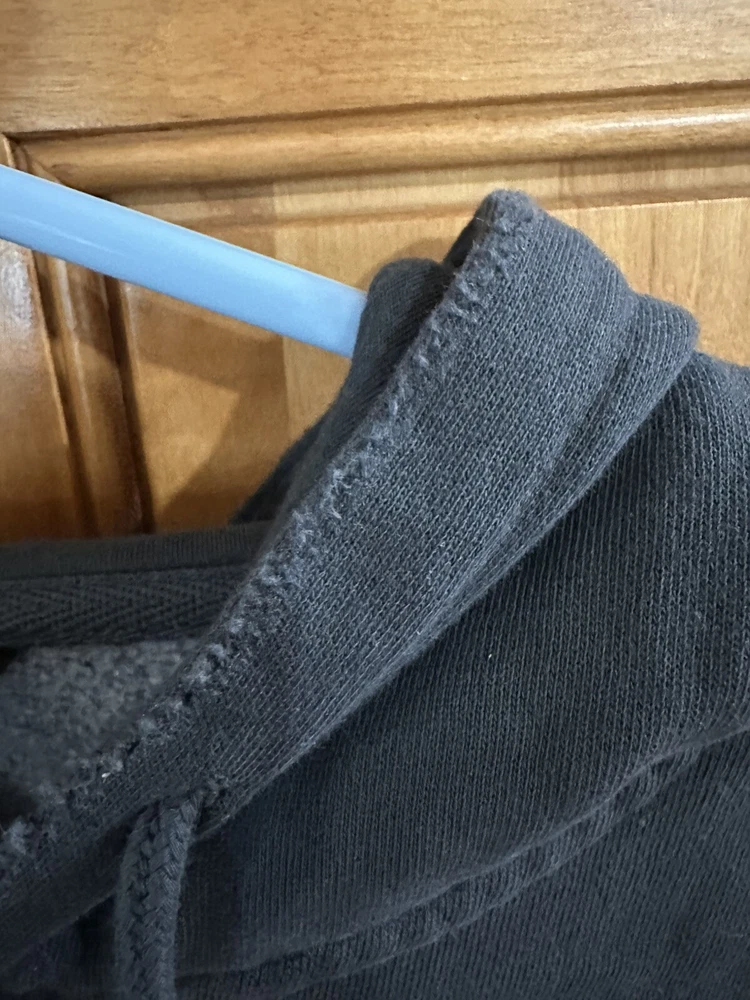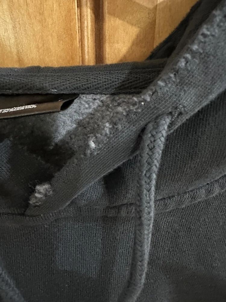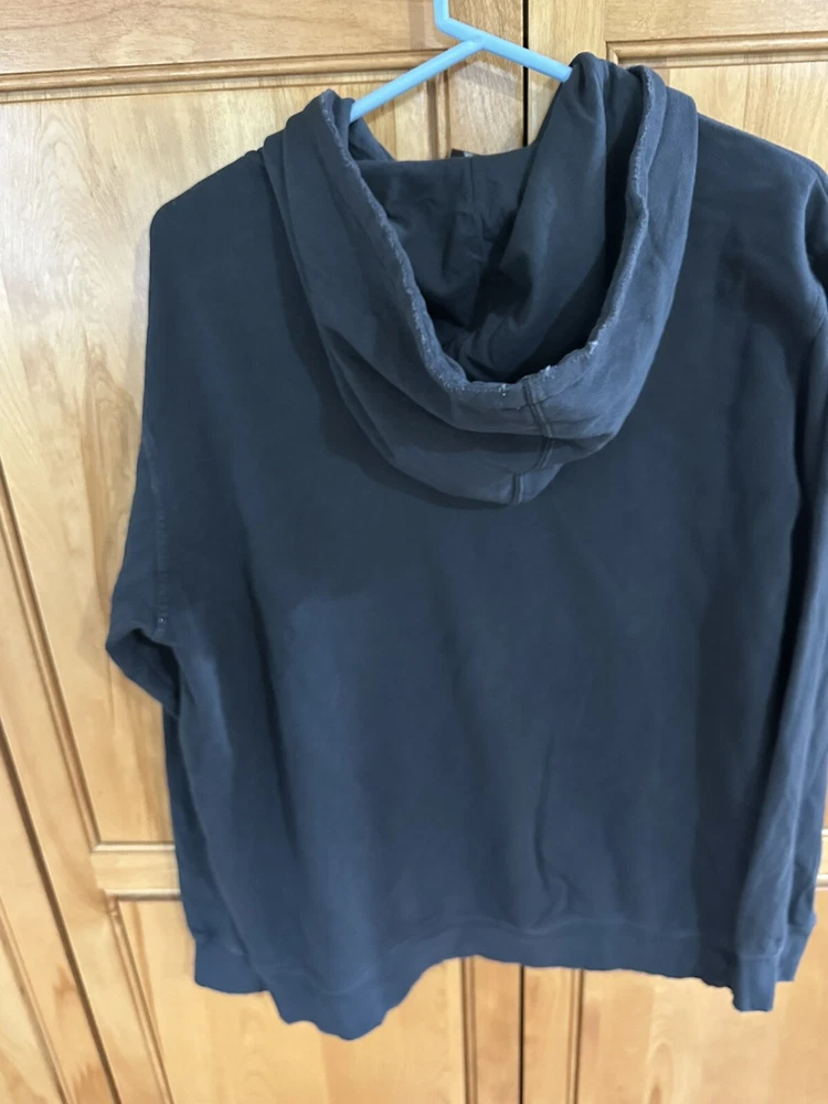 This cool kind of charcoal grey size medium sweatshirt is in excellent condition with no problems- there is some distressing at cuffs and hood, but a glance at others listed have the same- so think factory distressed. Chest 46”, length 28. Sweatshirt weighs just a few ounces over a pound. Please check my feedback and buy with confidence. Thanks!