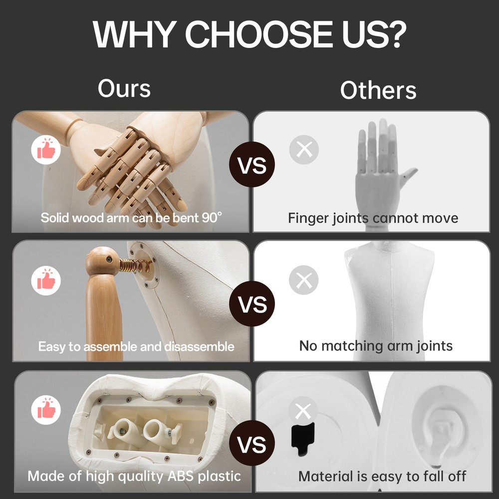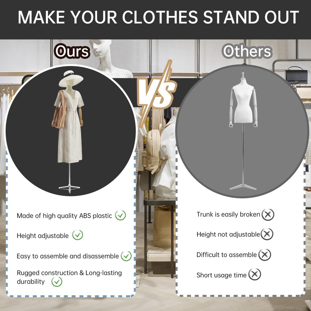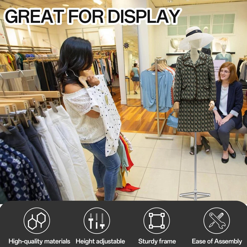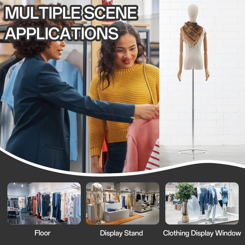 Store category Sign Up Now ! You may also like Product Description Bullet Points: Long-lasting Material: Crafted from solid ABS material, this mannequin dress form is not prone to breakage, wear-resistant, and reusable. It features solid wood arms, metal brackets, and a triangular base, ensuring strong and solid support for your creations Flexible height: Adjust the height of the clothing model from about 51.18 inches to 82.6 inches, fitting different clothes with a chest size of 33.8 inches, waist size of 25.1 inches, hip size of 33 inches, and shoulder size of 14.9 inches by operating the nuts and bolts under the torso, with a total torso height of 35.4 inches Sturdy Stand: Enjoy peace of mind with our female mannequin dress form featuring a stable base with a tripod bottom. Good for clothing stores, tailor shops, and boutiques, this stand provides strong support to prevent tipping and keep your mannequin securely in place Tool-proof Assembly: Experience hassle-proof setup in minutes with this mannequin dress form and stand. No tools required! Lightweight and easy to move, it's good for on-the-go fashion designers Broaden Your Display Options: With this mannequin dress form and stand, showcase sweaters, T-shirts, jackets, dresses, shirts, tops, and accessories in diverse locations like counters, tiered display racks and the floor Its stable base allows for worry-proof usage, and it's easy to assemble and disassemble with the nuts and bolts under the torso. Applicable gender: neutral/both men and women Applicable people: underwear models Clothing props: model type Model material: ABS Rod color: silver Triangular base color: silver Product list: Model support rod * 1 piece Base * 1 piece Hands * 1 pair Body * 1 piece Model brain * 1 piece Payment Delivery details Terms of sales About us Feedback & DSRs Payment Before you palce an order, please kindly make sure that you have a paypal account. We accept PAYPAL payment only. Payment should be completed within 2 days after auction closed, or unpaid dispute will be filed for an closing auction. An unpaid case will be filled after 4 days. Delivery details We ship to your eBay address. Each package will be shipped to US by UPS Regular Parcel with tracking number. Please check your shipping address carefully before checkout, it can't be changed if order completed. All items will be shipped within 1-2 business day upon receipt of payment.Orders placed on weekend will be shipped within 3 days. If you do not receive your item in 7-10 business days.please contact us immediately for further assistance. We will be responsible for any damages or losses incurred in the shipping process. About us We maintain high standards of excellence FIVE STAR and strive for 100% customer satisfaction! Positive Feedback is very important to us. We hope that you contact us immediately Before you give us neutral or negative feedback, so that we can satisfactorily address your concerns. We promise to offer the lowest price and high quality produce. Our working time: From Monday to Friday(9:30 am to 18:00pm), we don't working on holidays ,hope you can understand and know that , thank you. Please always talk to us via ebay Message. We appreciate your business and look forward to growing our e-Bay sales with satisfied customers. Feedback Contact us If you have any questions, please feel free to contact with us by ebay Message during our business hours ( 9:30a.m. to 5:30 p.m.), or email us through eBay, we will try our best to help you to resolve it. For any presale or after-sale questions,please do feel free to email us! Due to the time difference, each email will be replied within 1 working day,and weekend will be delayed a bit. Feedback