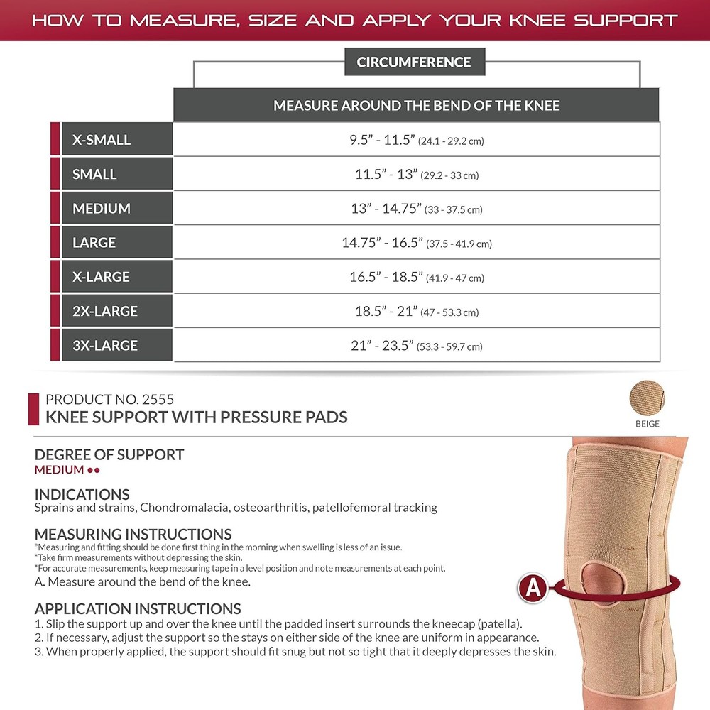 Powered by Frooition All Items See our eBay store for more great items >> Shop Categories Other Shoes and Boots Coats and Jackets Back Braces Wrist Braces Knee Braces Compression Hosiery Socks Camping Gear Misc. OTC Knee Support with Pressure Pads, X-Large Item Description Product Category : Health and Personal Care UPC : 048503255565 Title : OTC Knee Support with Pressure Pads, X-Large Walmart Subcategory : MedicalAids Description : This is for one OTC Knee Support, Pressure Pads, Knit Elastic OTC brand (model 2555) knee support with pressure pads. This is a heavy duty, controlled stretch knee support that helps reduce swelling and minimize pain while allowing full range of motion. Dense foam support pads on either side of the kneecap add stability and help maintain proper alignment. The medial and lateral spiral stays bend with the knee, and help keep the elastic material fully extended, and enhance wearing comfort.