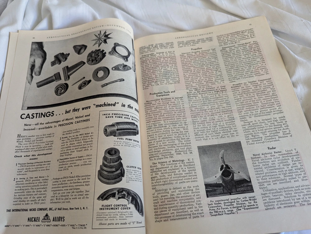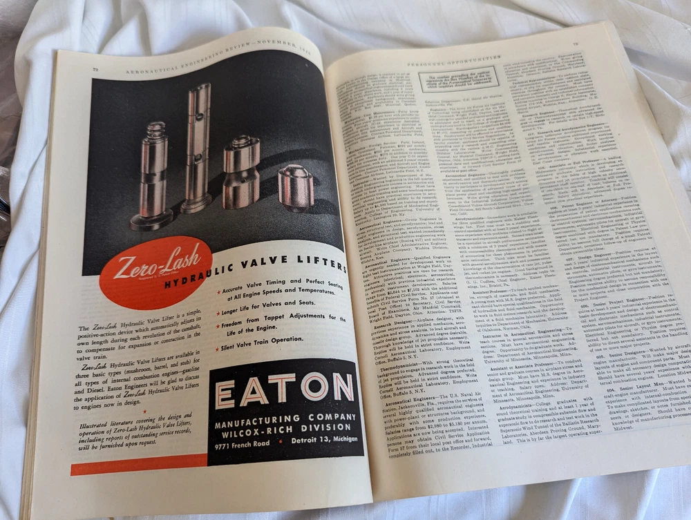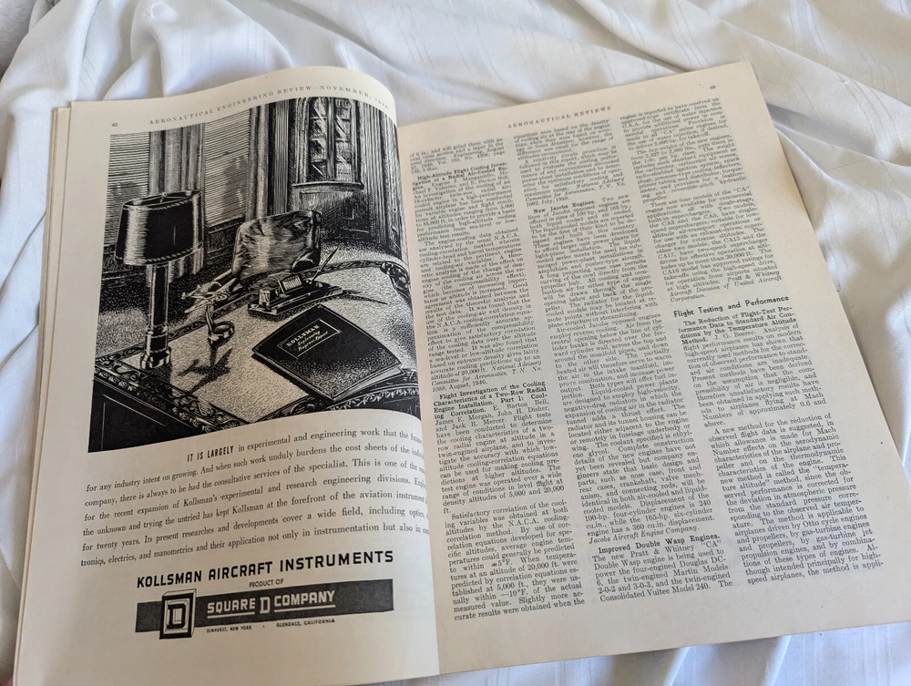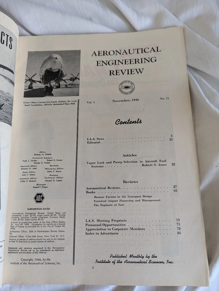 Great vintage Aeronautical Engineering Review from the Institute of Aeronautical Sciences, Inc. November 1946, Volume 5, No. 11. 82 pp. Please see the photos. Looking for art glass, china, sterling silver, aviation collectibles? Check our store, we have more! Please ask questions! We combine shipping costs! Priority Mail and Ground Advantage now includes up to $100 of insurance. Check out my store! You will find clothing, accessories, antiques and aviation collectibles – even some stuff for the kids! Item comes from a smoke free, pet free home. Email me if you have any questions! Thanks for looking! A note about feedback: If you are planning to award less than five stars for any of the categories, please email me and let me know if there is an issue. I do my best to start items at the lowest possible price and provide great service. The rating system is how eBay charges the sellers our fees – so it is very important to us! Also, regarding shipping costs, I have no handling fees. The tracking number for your package inside the USA will be emailed to you. International purchases are handled by eBay. I do not end auction items early – ever!! It is not fair to everyone else, so please do not ask! Returns: Please measure your favorite fitting pieces of clothing in your closet and compare the measurements to the listing. If an item does not fit, it is not eligible for return. I do not refund shipping costs. If I have missed something or have grossly misrepresented an item, please contact me through the eBay email system and I will happily consider your item for a refund. Sign up for my newsletter! You will receive updates on new things in my store!