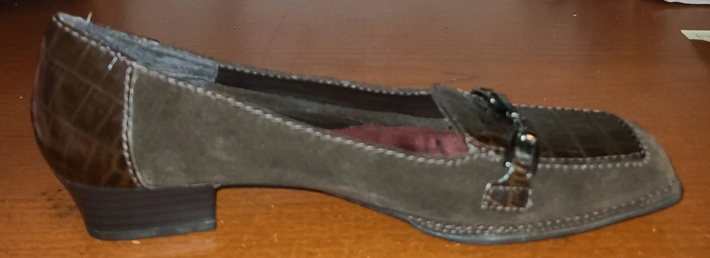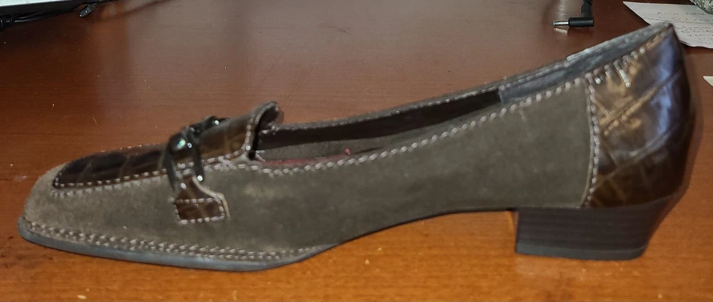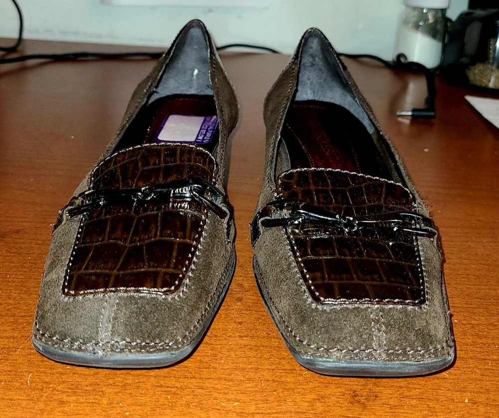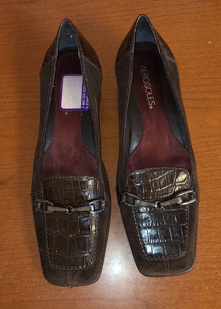 Elevate your work wardrobe with these stylish wedge slip-on loafers from Aerosoles. These glossy brown croc print shoes are perfect for any occasion and feature a square toe shape, comfortable wedge heel, and slip-on closure for easy wear. Made with synthetic upper material, these shoes are both durable and fashionable. The comfortable shoes have a medium width and are perfect for women with US shoe size 7. The crocodile pattern and the brown color give it a unique look that is perfect for any formal or casual occasion. Whether you're looking for a comfortable shoe for work or a stylish one for a night out, these Aerosoles Playfill loafers are the perfect choice.