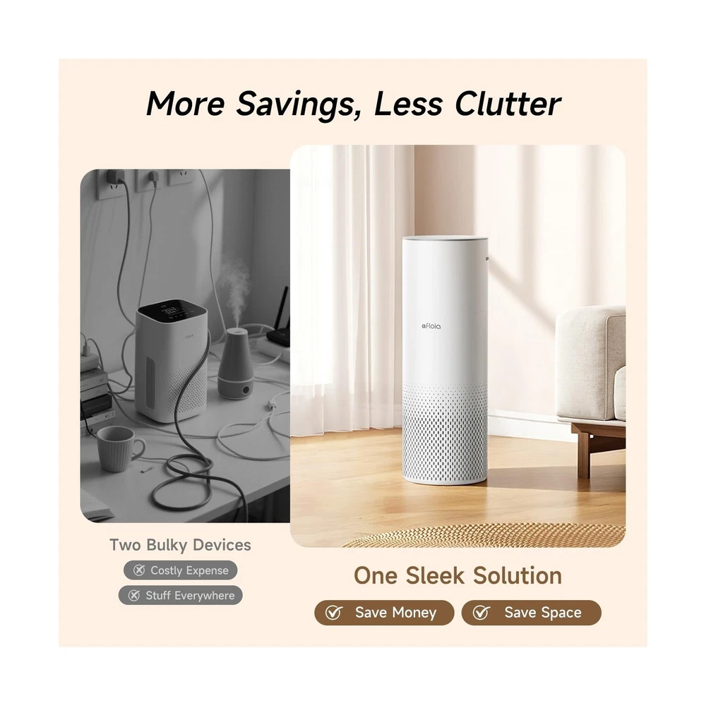 Afloia Humidifier and Air Purifier in One, Air Purifier and Evaporative Humidifier Combo for Home, 24dB Quiet Air Cleaner Remove Pets Dust Dander Hair Allergy Pollen Smoke Smell for Room Description Features: 2-in-1 Air Purifier & Humidifier: Kilo Pro - Simultaneously purifies and humidifies air. Covers up to 1076 ft2 per hour, perfect for bedrooms, living rooms, and offices (Note: Humidifier function cannot be used separately) 3-Stage Filter: Improves overall air quality and helps relieve coughing, sneezing, and allergy symptoms Mist-Free Humidification with Evaporative Technology: Uses natural cold evaporation and a humidifier filter to release clean, evenly dispersed moisture. No water puddles, no white dust 7-Color Ambient Light: Customize the atmosphere with 7 soothing light colorsideal for any room. Light automatically softens in Sleep Mode, create a calming environment for rest 3 Fan Speeds & 8-Hour Timer: Choose from three fan speeds to control purification and humidity levels based on your room's needs. Set the auto shut-off timer for up to 8 hours for worry-free use day or night Remote Control: Easily turn the device on/off, adjust fan speeds, lights, and timer settingsall from across the room. No need to get up from your bed or sofa Top-Fill Water Design: Refill with ease by removing the top mesh lid and pouring water directly insideno need to remove or flip over a bulky tank Whats in the Box:Air Purifier 1, Humidifier Module 1, 3-Stage Filter 1, Humidifier Filter 1, Power Adapter 1, Remote Control 1, User Manual 1, 1-Year Warranty for Peace of Mind Product Details: Color: White Brand: Afloia Product Dimensions: 7.6"D x 7.6"W x 21.8"H Floor Area: 46 Square Inches Specification Met: CE Certified, EPA Certified, FCC Certified Product Dimensions : 7.6 x 7.6 x 21.8 inches; 7 Pounds Item model number : Kilopro Date First Available : May 19, 2025 Manufacturer : Afloia Best Sellers Rank: #144,716 in Home & Kitchen (See Top 100 in Home & Kitchen) #300 in Home Air Purifiers #300 in Home Air Purifiers Customer Reviews: 4.7 4.7 out of 5 stars 39 ratings Delivery We Do Not Ship Outside of the Continental US. Return Policy All items qualify for returns within 30 days of receipt. Feedback We take our reputation seriously, we buy and sell online, so we understand the value of trust. If you are unsatisfied with your order, please contact us and we will work with you to resolve it to your satisfaction.