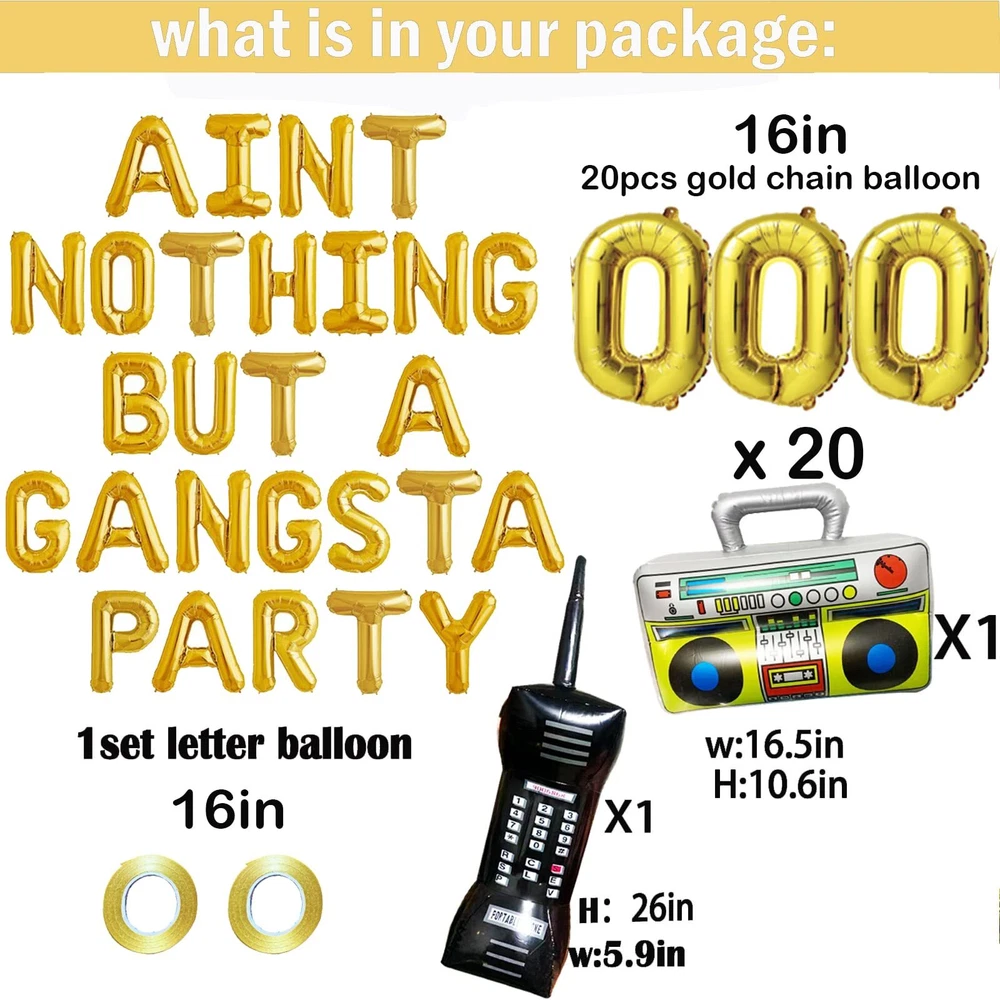 Aint Nothing But A Gangsta Party Balloon Banner Hip Hop Party Decorations Gold Jumbo Chain Balloons Inflatable Mobile Phone Radio Boombox Backdrop for 70s 80s 90s Hippie Retro Party Decor Supplies Aint Nothing But A Gangsta Party Balloon Banner Hip Hop Party Decorations Gold Jumbo Chain Balloons Inflatable Mobile Phone Radio Boombox Backdrop for 70s 80s 90s Rock Hippie Party Retro Party Decor Supplies Golden Number Balloons: 20 foil number balloons in gold color Gangsta Party Banner: 16 inch letter banner with 'Ain't Nothing But a Gangsta' text Inflatable Radio: 1 inflatable mobile phone radio balloon Boombox Backdrop: 1 large boombox balloon for party decoration Perfect for Retro Parties: Ideal for 70s, 80s, and 90s themed parties Shipping from the USA All of our products are shipped from the USA, ensuring quick delivery to your destination. Payment We offer the following payment methods: PayPal, credit card, bank transfer, and eBay's secure payment system. Free Shipping & Free Returns Shipping within the USA is FREE. Additionally, any return is absolutely free for you. Risk-Free Purchase You have the option to return an item within 30 days without any justification. We cover the return shipping costs! Fast Shipping We ship immediately upon receipt of payment. Generally, the package is delivered within 2-3 days in the USA. If it takes longer, we will contact you. Quality and Costs Made in Europe, USA, China No customs fees or additional charges Total satisfaction guarantee Invoice with declared VAT available upon request in .pdf format Feedback Your feedback is very important to us. After you pay for your purchase, you will automatically receive positive feedback from us.