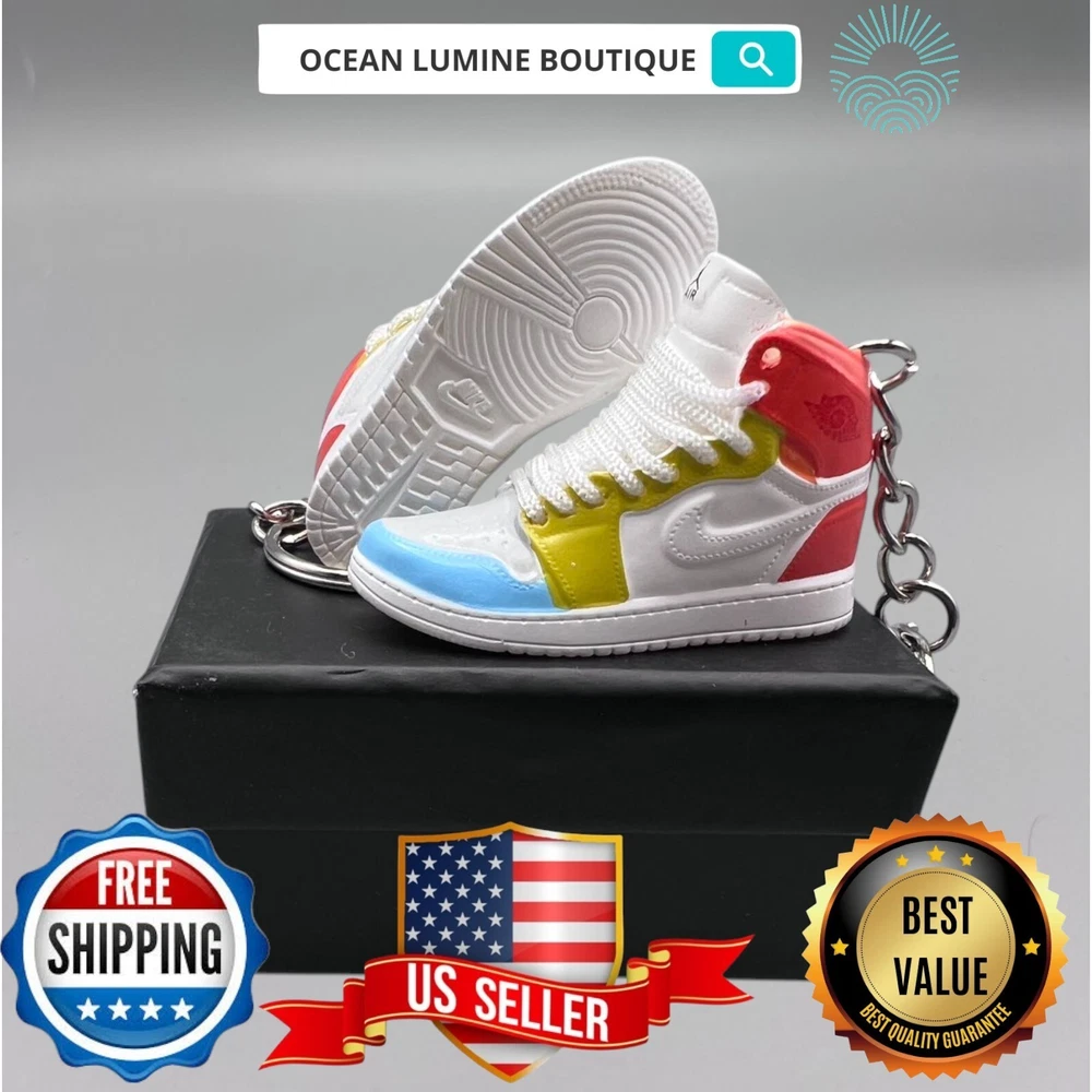 PLEASE READ BEFORE YOU PURCHASE You get the style in the very first pic, if you searching for more styles plz visit my page This is the best quality you can get, many other cheaper ones have poor quality, I know all the factories trust me, some really be making crap and you can not tell from the pictures. Handcrafted and hand-painted 3D Mini Sneaker Keychains inspired some of the most coveted sneakers ever produced Materials as ABS Plastic (Soft Plastic) Jordan pin color will be given randomly (If chosen) All Shoe keychain size is about 2 1/2 (L) x 1" (W) x 2" (H) The shoe Tongue is movable, it is not cracked or broken. Random shoe box styles will be given, if you have a preference please get in touch with me. These are all handmade and hand-painted with better paint, if you want to find a lower price please seek lower quality, my key chains are the best quality you can find. We've been selling these key chains for 3+ years, and have the most styles & best quality with super fast shipping. Search OCEAN LUMINE BOUTIQUE on any search engine to visit us! CLICK ME FOR MORE STYLES Disclaimer Product packaging, specifications, and prices are subject to change without notice. All information about the products is provided for information purposes only. Please always read labels, warnings, and directions provided with the product before use. Shipping We will ship all orders within 2 business days of payment, we provide free upgrade USPS shipping service up to 2-DAY Priority if Urgent Contact We can be contacted at any time through eBay messages if you have any questions, comments or product requests. We will respond to you within 24 hours and do our best to help you out! Features and further details 3000+ keychains in stock with up to 400+ styles We do bulk orders with discounts and provide long-term business relationships More styles are available in my shop PP WORLD