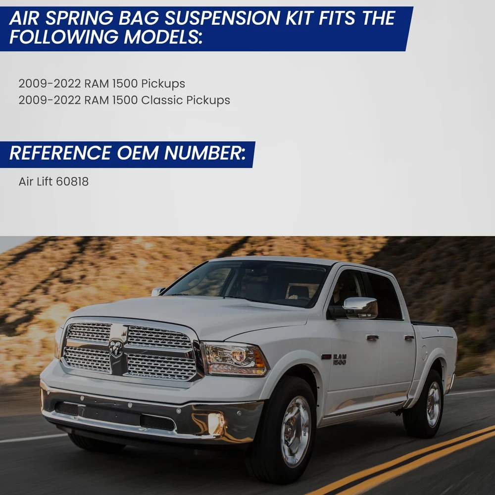 VEHICLE MODELS COMPATIBILITY LIST -- Rear air spring suspension kit compatible with 2009-2022 RAM 1500 Pickups and 2009-2022 RAM 1500 Classic Pickups. REPLACEMENT OEM NUMBER -- Replaces AirLift 60618 loadLifter 1000 ultimate plus kit. EXCELLENT PERFORMANCE -- Up to 1,000 pounds of load leveling capability, adjustable air helper springs level your load, increase your safety and comfort with no load, loaded, or towing on any road condition. PACKAGE -- 2pc of air b ags, all brackets, installation manual, bolts and nuts you need for installation, inflation valves, elbow fittings, and tubing. EASY TO INSTALL -- With strict production standards, air helper spring kit are designed to match the original equipment. You can follow our installation manual and complete the installation step by step.
