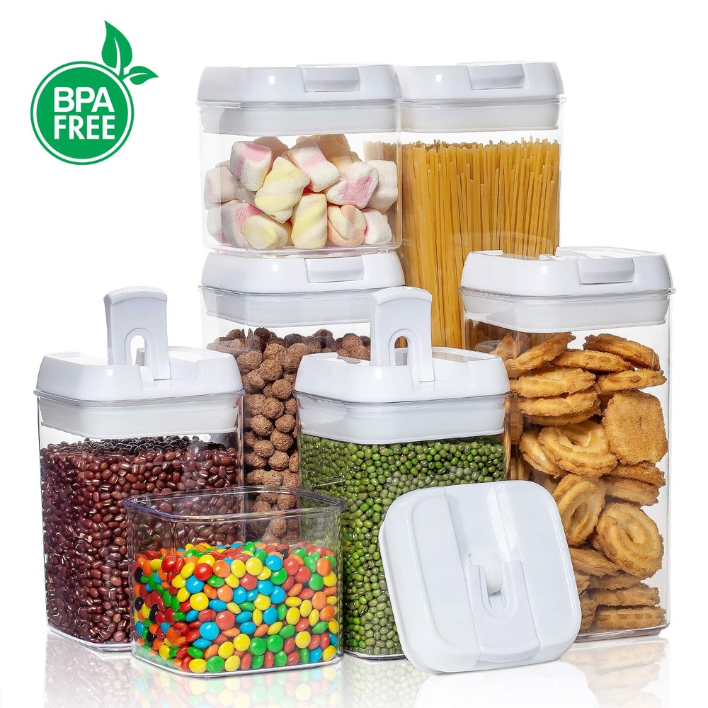 Vtopmart Airtight Food Storage Containers, 7 Pieces BPA Free Plastic Cereal Containers with Easy Lock Lids, for Kitchen Pantry Organization and Storage, Include 24 Labels, White Help Organize Your Kitchen and Pantry----Imagine waking up every morning and walking to the kitchen to make some breakfast, found everything is neatly organized. No longer messy, you can get everything you want very quickly. They will make you feel easy to organize the pantry. One Set Include 7 Pieces Containers----1 Tall Container (1.8L/1.9qt), 2 Medium Containers (1.2L/1.2qt ), 2 Small Containers (0.8L/0.8qt), 2 Mini Containers (0.5L/0.5qt). Perfect for storing flour, sugar, rice, grain, nuts, beans, snacks, pasta, coffee and tea! Clear containers allow you to identify contents----Made of high quality BPA free material, our air tight containers are durable and shatterproof. The plastic of these containers is very clear, you can identify the contents without opening them. Air-Tight to keep food dry and fresh----With special sealing mechanism, you can open or close our plastic containers safely by using only two fingers. Simply flip the ring to open or flip the ring down to lock and seal. 24 Reusable Labels ----These labels will help you never confuse flour with powdered sugar or baking powder with baking soda. They are reusable, you can switch contents whenever you need. TIPS--NOT DISHWASHER SAFE !!! Please don't use the dish-washing machine for cleaning the container, please wash the contanier by hand. Do you always feel hard to organize your pantry and kitchen? Why not choose our airtight food storage containers, they will make it easy for you to organize your pantry. 1. Made of durable plastic material, our flour storage container will be a great helper for you to organize your pantry. 2. The top is wide enough to take out food easily , you also can get your measuring cup or spoon in to measure. 3. Outside measurement markings make it much easier to know exactly how much food left and determine whether it requires replenishment. 4. With special design airtight lids, these plastic containers not only can keep your food fresh. Brand : Vtopmart Product Quality Grade : Food Grade Lid Material : Plastic + Silicone Container Material:Plastic Features : Recyclable / Healthy / BPA Free / Dishwasher Safe Color:White Lids +Clear Body Looking Package Include : 1 Tall Container (1.9 liters), 2 Medium Containers (1.2 liters), 2 Small Containers (0.8 liter), 2 Mini Containers (0.5 liter), 24 Labels Shipping We offer FREE shipping on all orders! We ship within Three business days of payment, usually sooner. We use a selection of shipping services such as UPS, FedEx, USPS etc. We only ship to the lower 48 states, no APO/FPO addresses or PO Boxes allowed. Local pickups and combined shipping options are not provided at this time. International buyers – please note: Import duties, taxes, and charges aren't included in the item price or postage cost. These charges are the buyer's responsibility. Please check with your country's customs office to determine what these additional costs will be prior to bidding or buying. Order Cancellation Policy * Order Cancellation Policy ** You can return a product for up to 30 days from the date you purchased it. 1. The seller reserves the right to cancel the special case only due to eBay cancellation fee. 2. The decision of seller is the final. 3. The seller will respond to the cancellation request within 2 business days. Please wait for the result of cancellation. 4. In case the cancellation is not completed by some reasons, the buyer can follow the options below to get the refund. 4.1 The buyer can reject the item when it arrives. 4.2 The buyer can send the item back to the seller within 30 days If the buyer receives item (USA Shipment ONLY). The seller will provide the FREE return label to the buyer when the buyer opens " Return Item" case on eBay by using the reason as "Change my mind" ONLY. 5. When buyer has placed the order. The order will be processed and completed by automatic warehouse system within 5 minutes. In case that buyer sends the cancellation request after 5 minutes of placing the order, the request will be rejected. **Sending direct message to cancel the order is not allowed for every case.* Return Policy - If buyer would like to return the items for refund or replacement, please CONTACT SELLER to receive the free return label from seller. The refund or replacement will be processed with the tracking number of return label which is provided by seller only. The other ways of return which are not approved by seller will not be processed for the refund or replacement. Return You can return a product for up to 30 days from the date you purchased it. Any product you return must be in the same condition you received it and in the original packaging. Please keep the receipt. Payment We accept payment by any of the following methods: eBay Payments Please pay as soon as possible after winning an auction, as that will allow us to post your item to you sooner! Feedback Customer satisfaction is very important to us. If you have any problem with your order, please contact us and we will do our best to make you satisfied. Contact Us If you have any queries, please contact us via ebay. We usually respond within 24 hours on weekdays. Please visit our eBay store to check out other items for sale! Thank you for shopping at our store.