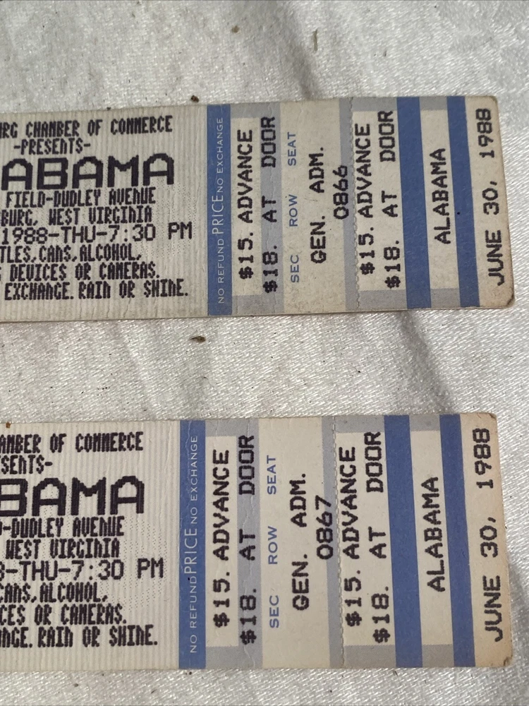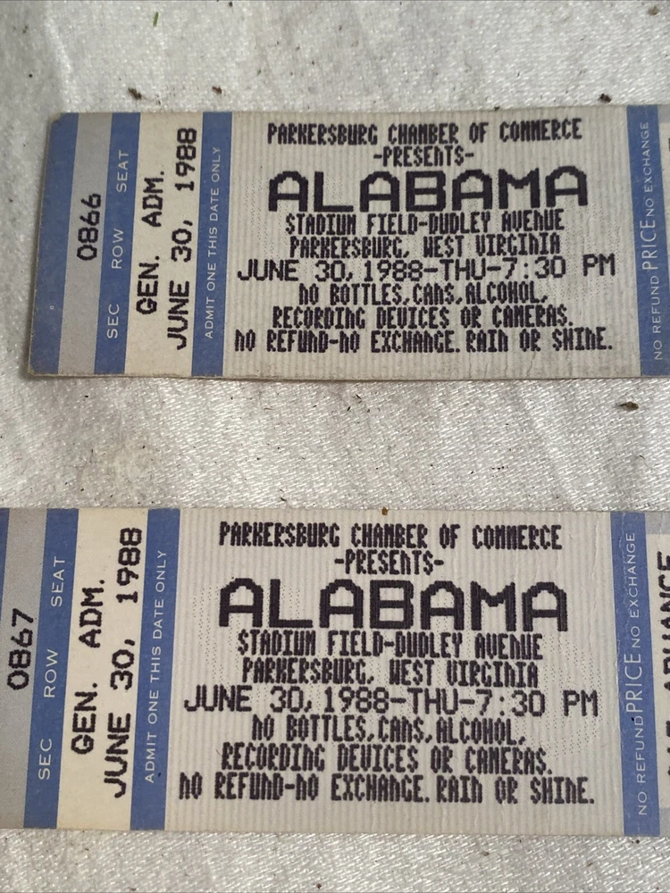 Alabama VINTAGE June 30 1988 CONCERT TICKET Parkersburg WV General Admin Pair