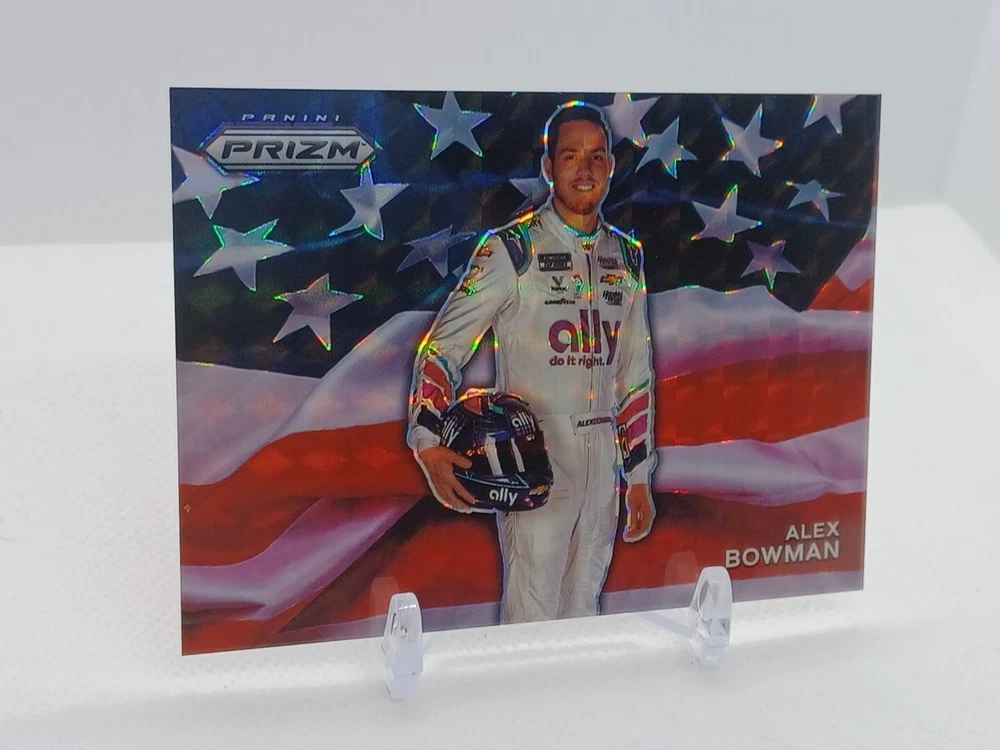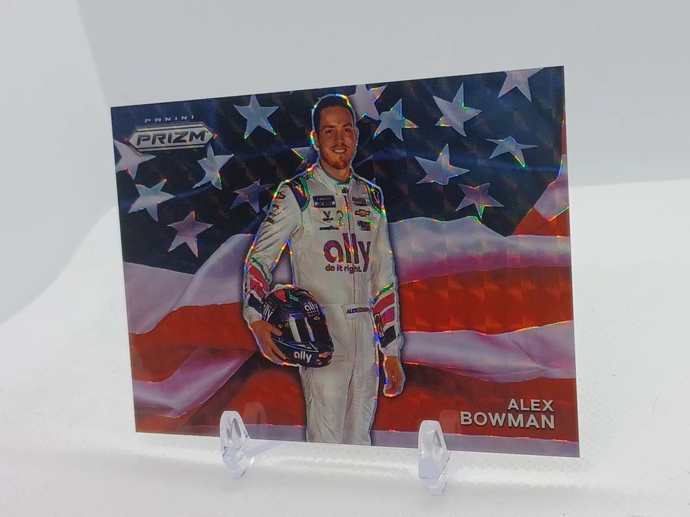 Up for sale is a stunning Alex Bowman 2022 Panini Prizm Racing USA Flag SSP #USA2 trading card. This card features beautiful holographic foil accents and is part of the highly sought-after 2022 Panini Prizm set. It is an original, not a reprint, and has been kept in pristine condition. This card is a must-have for any NASCAR or Alex Bowman fan and would make a great addition to any collection. It is a short print, with only a limited number available, and is a case hit for Hendrick Racing. Don't miss your chance to own this rare and unique card!