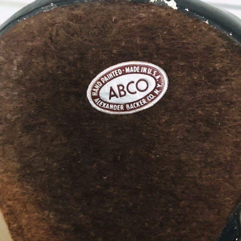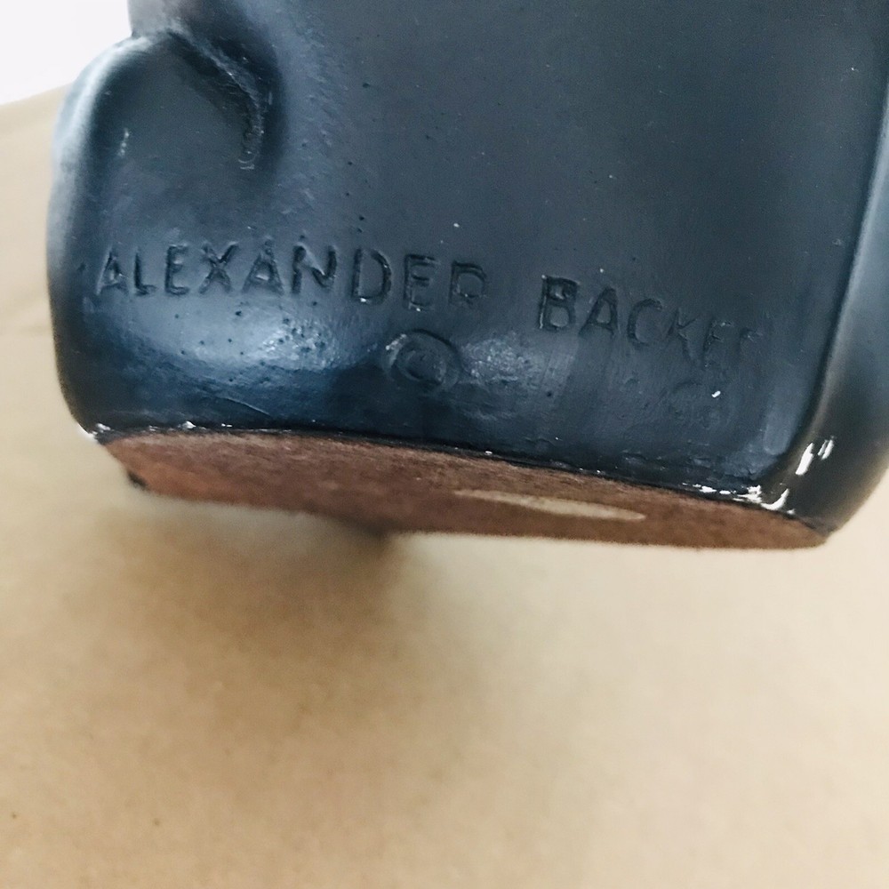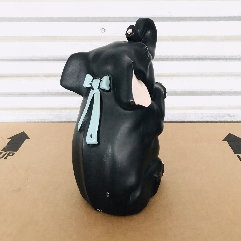 Vintage Alexander Backer ABCO Black Chalkware Happy Sitting Baby Elephant Sculpture Statue Figurine Decor Decoration • Measures approximately 9.5” tall • Material: chalkware • Hand-painted • Sculpture features a cheerful sitting elephant happily stretching its head upwards and wearing a pink bib around its neck. • Signed by Alexander Backer • Made in USA In preowned condition! VTG RARE