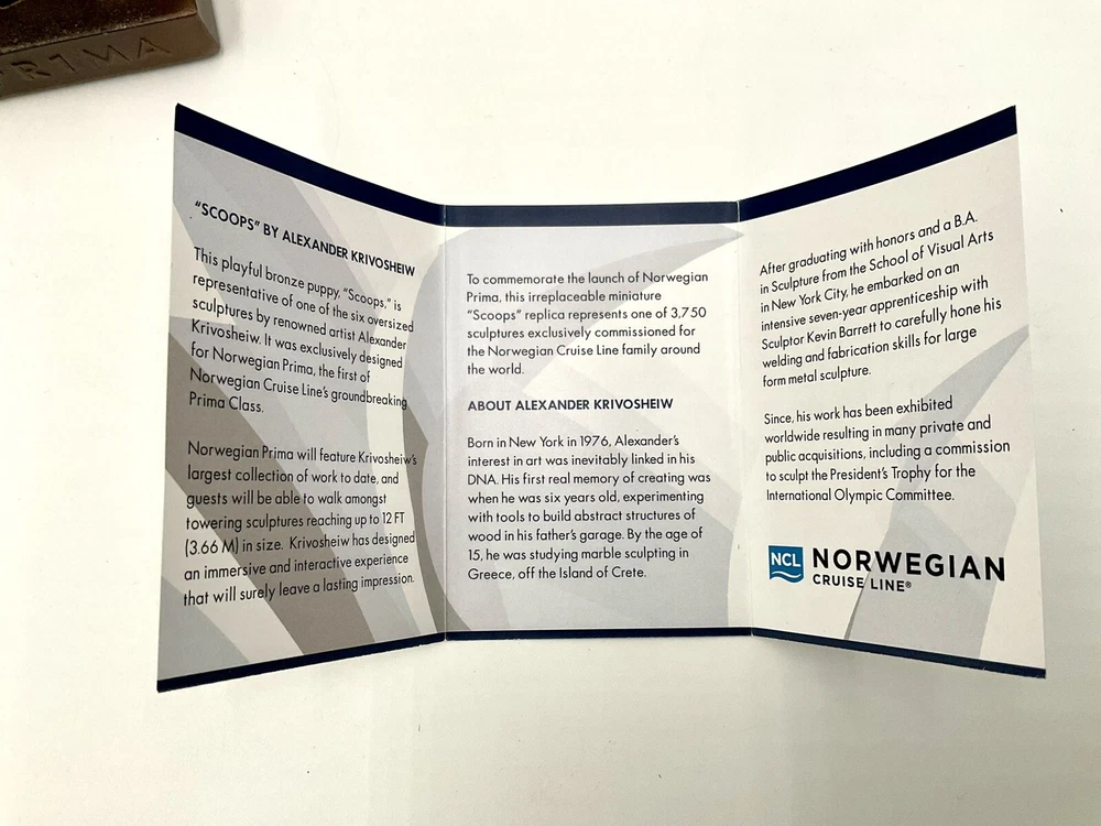 Alexander Krivosheiw Mini Scoops Sculpture - 1121 of 3750 NCL Norwegian Prima with Box Pre-owned condition. Please note there are small scuffs on bottom surface of base and there is sharpie on bottom of box. See pictures for flaws noted. Ships via USPS ground advantage. Thanks for looking!