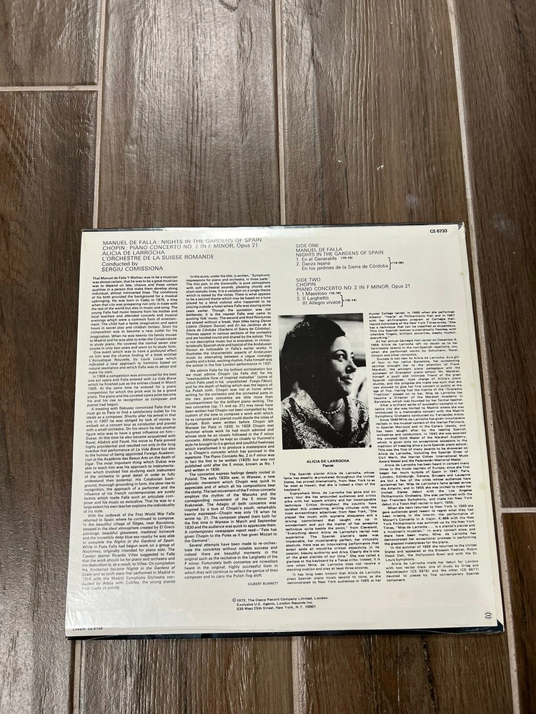 Experience the enchanting melodies of Alicia De Larrocha's vinyl LP, featuring the timeless compositions of Frédéric Chopin and Manuel De Falla. This collector's edition, first pressing LP is an ideal addition to your classical music collection. Appreciate the excellent sound quality and immerse yourself in the full-range fidelity of this 1972 release. The cardboard sleeve and original inner sleeve, along with the original cover, make this LP a true gem for any music enthusiast. Add a touch of elegance to your vinyl collection with this beautiful LP.