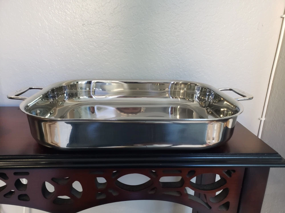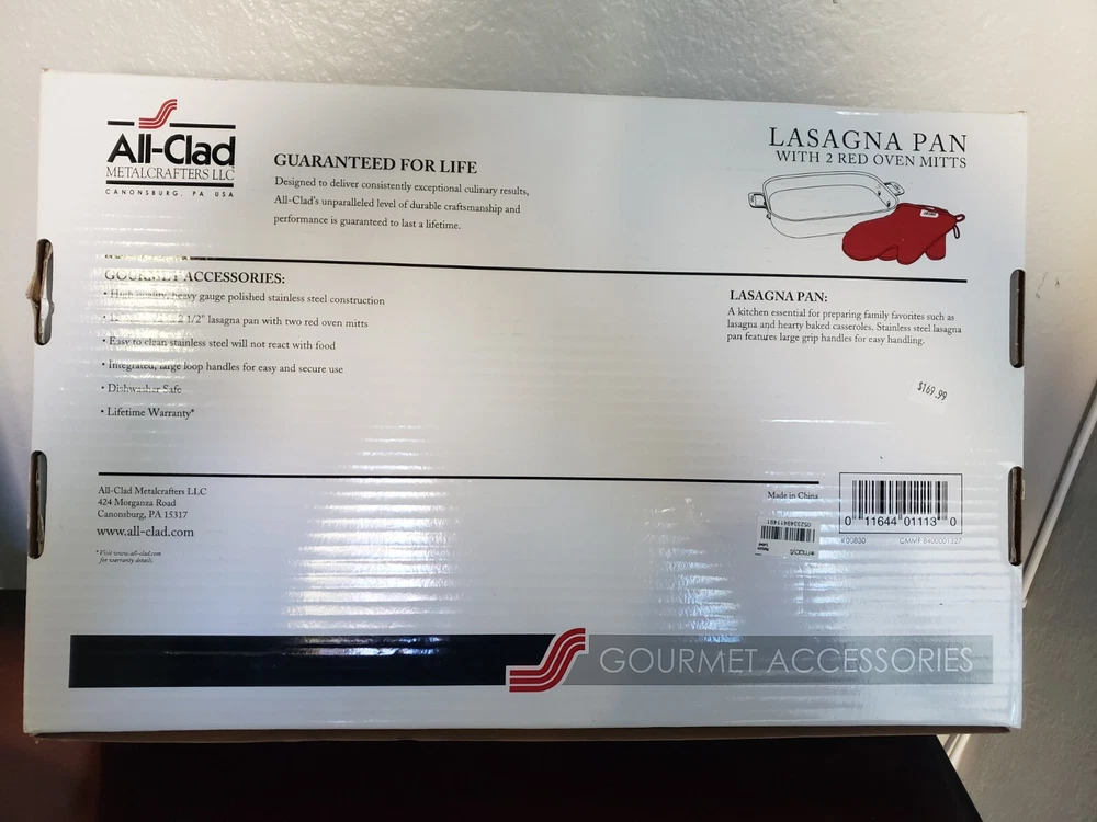 This beautiful All-Clad 18/10 stainless-steel lasagna pan comes with two red oven mitts, making it a perfect addition to your cookware collection. The pan is compatible with both electric and gas stoves and features a durable design that ensures long-lasting use. The red color adds a touch of elegance to your kitchen and the brand's reputation for quality ensures that you are getting a high-quality product. The pan is ideal for making lasagna and other pasta dishes, thanks to its unique design. It is easy to use and clean, making it a great choice for busy home cooks. Whether you are a professional chef or a home cook, this All-Clad lasagna pan is a must-have.