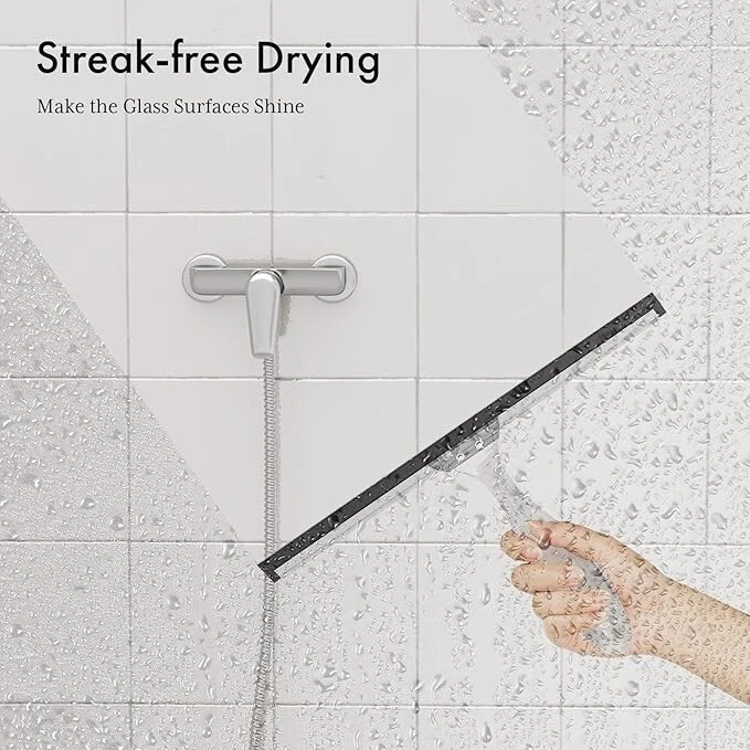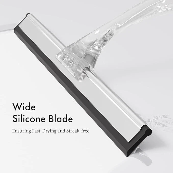 Shower Squeegee for Glass Doors, All-Purpose Squeegee with Suction Hook & Adhesive Hook, Clear Squeegee for Shower Glass, Windows, Mirrors, Tiles and Car Windows - 10 Inches, Clear About this item Acrylic Ergonomic Handle: Ditch the traditional metal handle and embrace the comfort and beauty of the clear acrylic handle. The curved design of our shower squeegee ensures a comfortable grip while the lightweight nature prevents wrist strain, making your cleaning experience more enjoyable. All-Purpose Squeegee: The wide silicone blade effortlessly removes water and foam from various surfaces such as shower doors, windows, mirrors, tiles, and car windows. Its versatility makes it a go-to tool for all your cleaning needs on smooth and flat surfaces. Shiny & Streak-Free: Say goodbye to streaks and smudges with ease. The window squeegee's efficient water-clearing ability ensures a sparkling finish every time without requiring vigorous scrubbing. Pair the glass squeegee with your favorite household cleaner for an added shine. Dual Hanging Options for Convenience: Enjoy the flexibility of two hanging solutions with the AmazerBath bathroom squeegee. Choose between the convenient suction cup hook for easy, removable placement or the reliable adhesive hook for a more permanent and discreet mounting option. Ideal for daily use and hassle-free storage. Sturdy & Durable Construction: Reinforced handle-to-blade connection ensures lasting durability and easy adjustments. Crafted from non-rust material, this shower door squeegee is built to withstand daily use and promises longevity, especially in damp environments like shower areas.