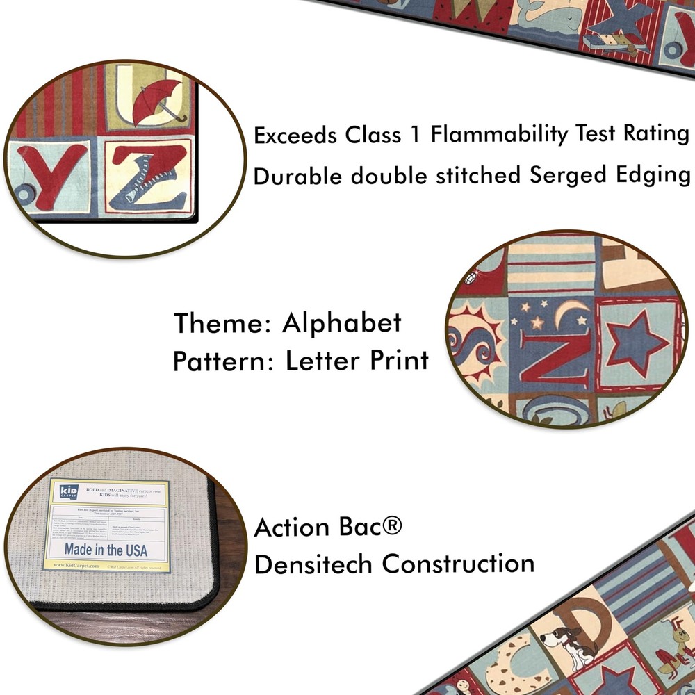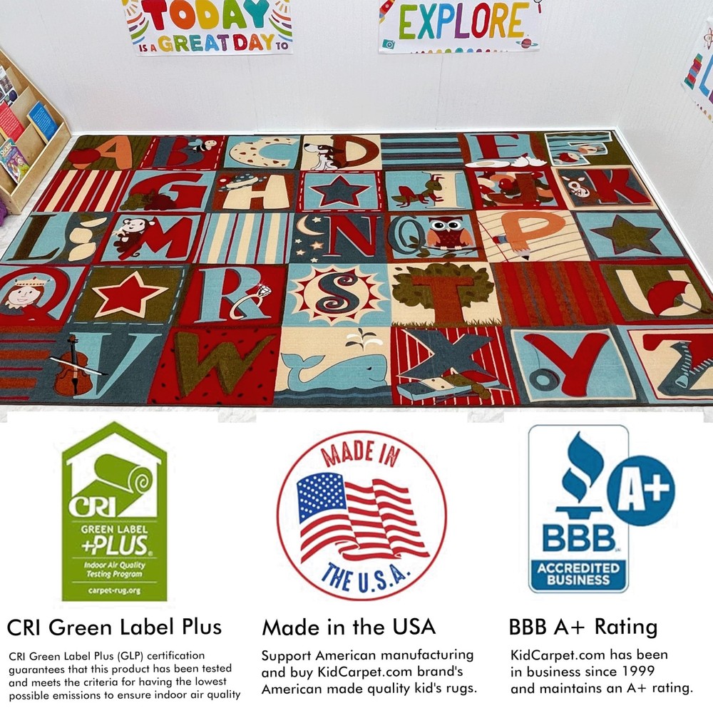 KidCarpet manufacturers the highest quality kid’s rugs on the market - Commercial quality classroom rugs, daycare rugs, and play rugs, all with bright and fun educational designs Class 1 fire rated for commercial use – KidCarpet rugs meet or exceed requirements for use in schools, daycares, and public childcare facilities Durable enough for the highest traffic areas – KidCarpet rug fibers are made of 100% tufted nylon with a thick double stitched nylon binding around the edge Stain resistant - KidCarpet classroom rugs are treated with a stain guard which protects against dander and spills Buy with confidence! – KidCarpet rugs are Made in the USA, CRI Green Label Plus Certified, and have a Lifetime Limited Wear Warranty