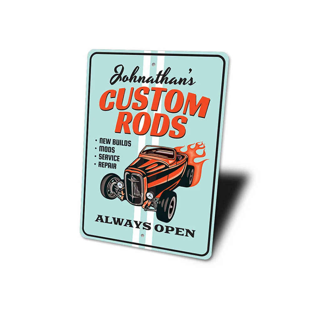 The Lizton Sign Shop Product Description Always Open, Custom Rods Shop Aluminum Sign **there may be slight variations in color and text spacing, however your sign will be very similar to the image above. Quality Aluminum Street Signs Sign Information Aluminum Brand New Sign Comes with rounded corners and pre-drilled for easy hanging. We use the highest quality materials - 100% USA-made! Great Gift Idea - Our signs truly make a one of a kind gift. Personalize the sign with the text you want to add. Custom text for the sign can be sent to us via email. A BRAND NEW SIGN!! All of our street signs are made of premium materials. The sign itself is made of aluminum and will never rust providing years of enjoyment indoors and outdoors. No Cheap plastic!! The Lizton Sign Shop specializes in quality personalized custom aluminum signs for any occasion. These make the perfect sign for any man cave, office, basement, garage, college dorm, kids bedroom, game room, bar, pub, tavern or countless other places. *Colors may vary slightly from one computer screen to the next but the image should be very close. All content and designs are subject to copyright and may not be reproduced in any form. Payment Methods We would prefer payment to be made through paypal but we also accept all major credit cards. If you select the credit card option please contact us after you make your purchase and we can walk you through the steps to make a secure payment. Return Policies We will accept returns within 30 days of the purchase date. The buyer is responsible for any costs to return the item or items. Returns will only be accepted for items that were damaged in shipping or if we made an error in the manufacturing of your item, i.e. spelling error.