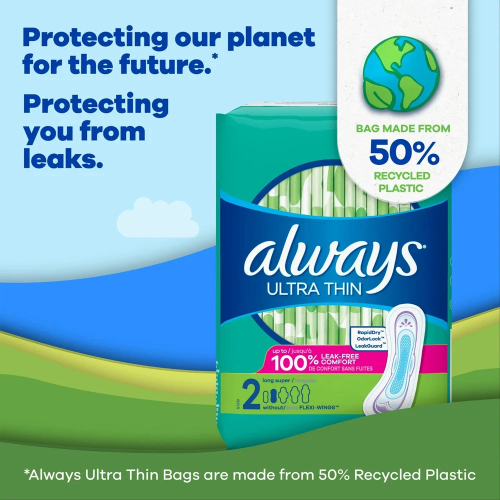 Product details If you think all pads are exactly the same - think again. Get up to 100% leak-free comfort from Always Ultra Daytime Pads with Wings. Plus, Always Ultra Thin Daytime Pads with Wings feature the 3X Protection System to give you peace of mind. Always pads RapidDRY works to wick away gushes in seconds and absorbs 90% faster than the leading store brand. The Always pads LeakGUARD core locks in leaks and absorbs more than you may need. And Always pads OdorLOCK neutralizes odors to help you feel fresh and clean throughout your day! Are you getting the right protection from your Always pads? Did you know that 60% of women are wearing the wrong size pad? Using the wrong pad size can lead to leaks. Step up in size to help stop leaks. till not sure which Always pads size is right for you? Check out Always pads Combo Chart, a sizing guide that helps you find the best protection based on your flow AND panty size. Whether you have a heavy flow or a light one, you can easily use the size chart to find your best fit for day and night. Don't forget that Always pads is FSA eligible! Check with your FSA or HSA plan provider on the coverage of period care products. 40CT If you're looking for up to 100% Leak-Free Comfort, you've come to the right place Provides thin, flexible protection without the bulky feel Quickly wicks away gushes with RapidDRY technology, absorbing 90% faster than the leading store brand Provides incredible long-lasting protection with a LeakGUARD Core to lock in leaks Helps to prevent unwanted odors with OdorLOCK to keep you feeling super fresh FSA eligible: Check with your FSA or HSA plan on the coverage of period care PACK MADE WITH 50% RECYCLED PLASTIC, at a site that purchases 100% renewable electricity COMFORTABLE ULTRA THIN PAD provides flexible daytime protection without the bulky feel 40CT