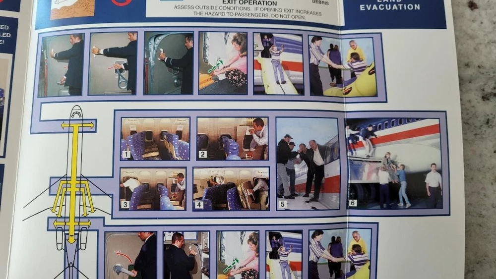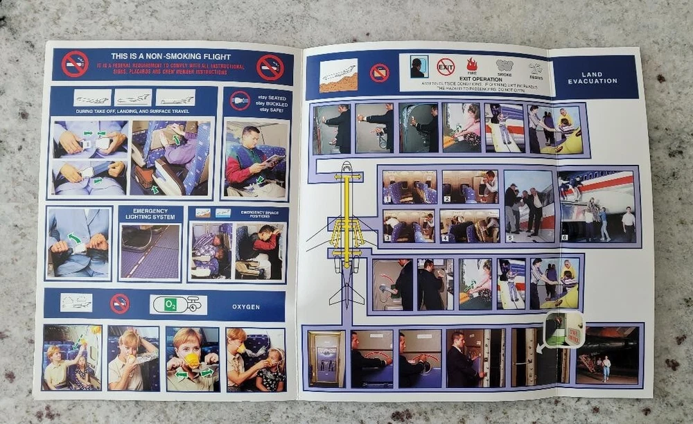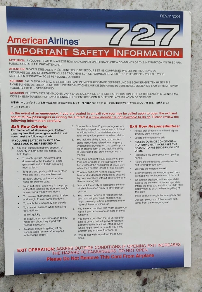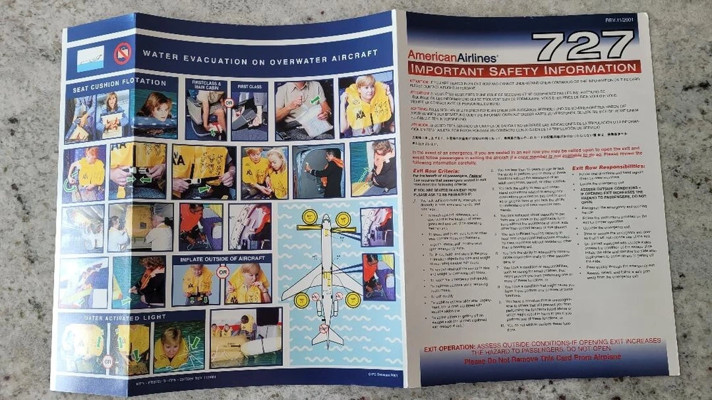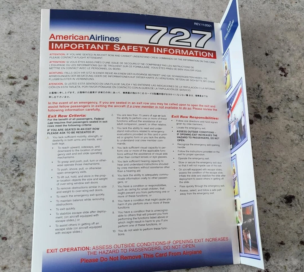 This is a never used, tri-fold safety card for the American Airlines B-727 which is dated back to November 2001.. Colored pictures showing land & water evacuations, inflation of life vest, use of oxygen & more.. It has NO soda / coffee stains or tears, nothing sticky and no writing on it.. Perfect condition....