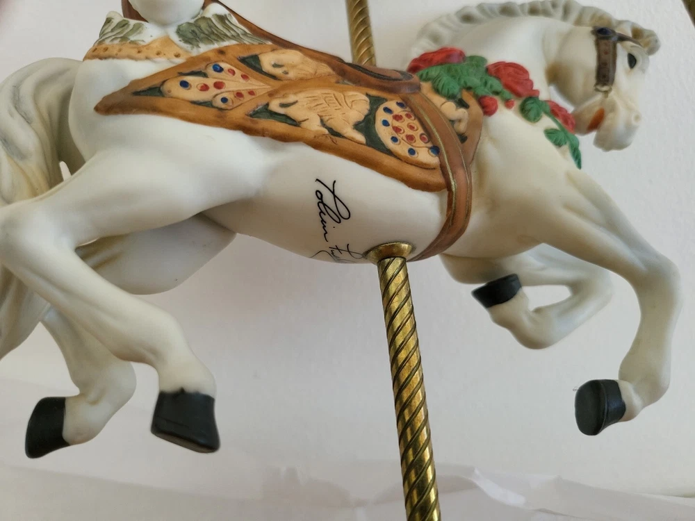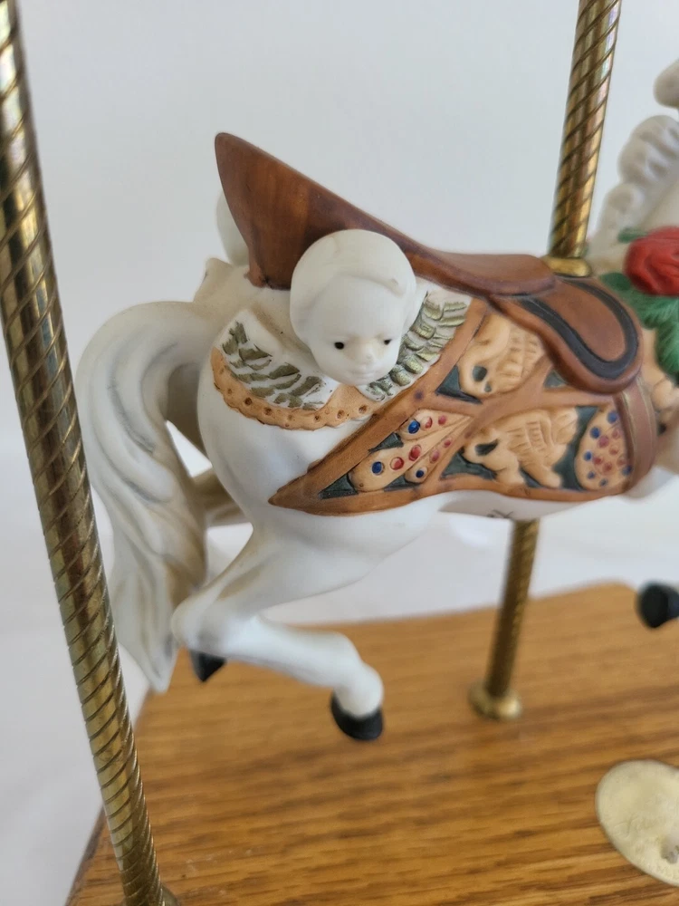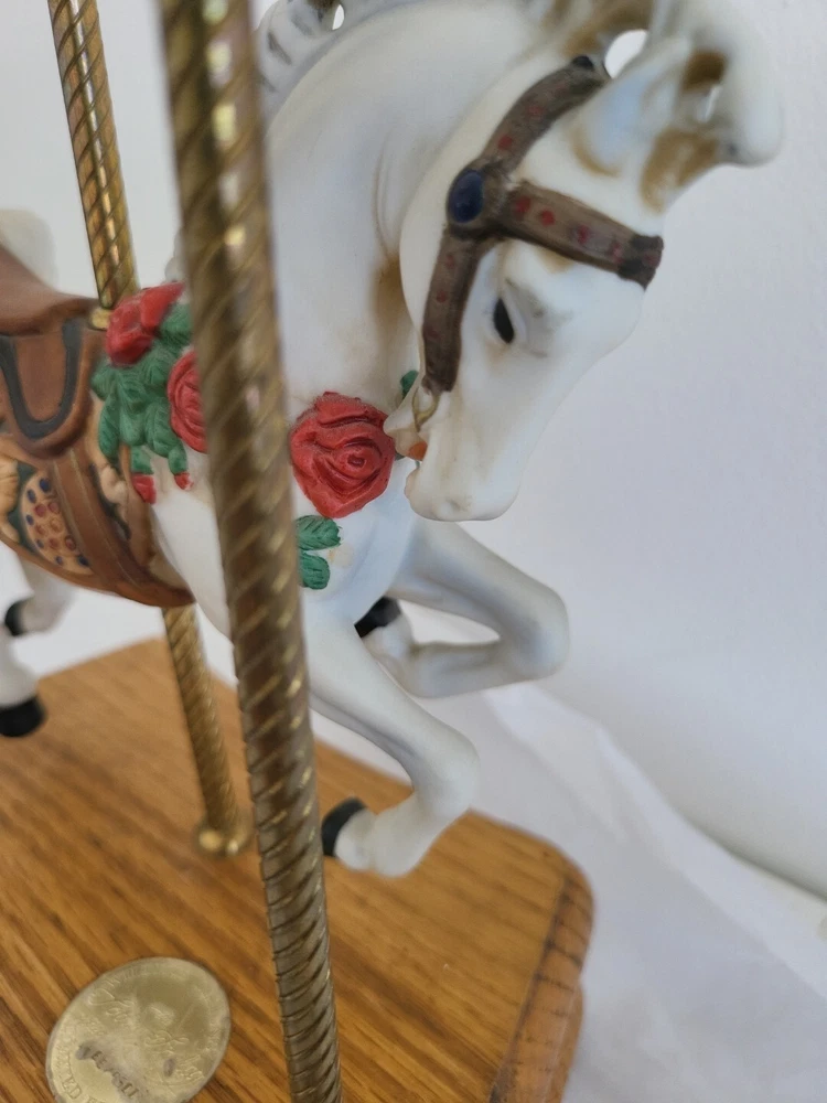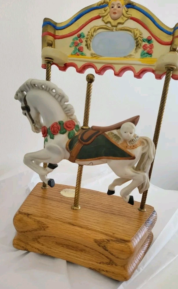 This American Carousel music box features a beautiful design by Tobin Fraley and Willitts. Made in Taiwan, it consists of ceramic and porcelain materials in a multi-color scheme. The box is perfect for collectors of decorative items, with a style that complements any American home. The mixed materials give it a unique touch, making it a great addition to any collection.