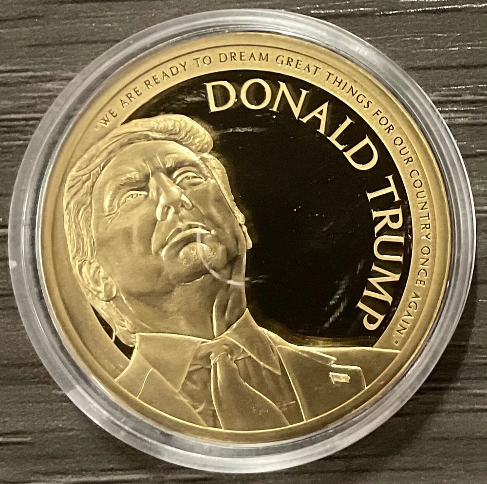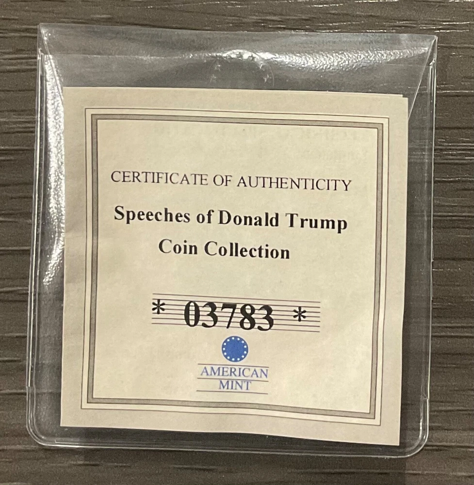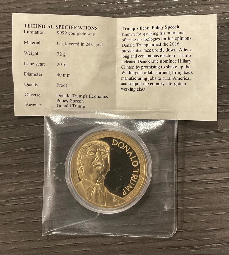American Mint Layered 24k Gold Donald Trump’s Economic Policy Speech Proof Coin Note: This American Mint proof coin is being sold as is. Please refer to photos for images of the actual coin. Maker: American Mint Material: Cu (Copper), Layered in 24k Gold Issue Year: 2016 Diameter: 40mm Quality: Proof Observe: Donald Trump’s Economic Policy Speech Reverse: Donald Trump Lot # 9-27-24-103 FREE Shipping in the U.S.A.