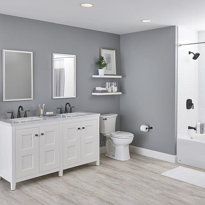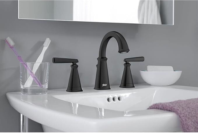 American Standard 7018801.243 Edgemere 8-Inch Widespread 2-Handle Bathroom Faucet, Brass, Matte Black BATHROOM SINK FAUCET: Edgemere 8-Inch Widespread Bathroom Faucet with Two Handles and brass spout features tapered edges and a lifetime of drip-free performance for a perfect addition to any bathroom; Coordinates with the Edgemere collection DRIP-FREE PERFORMANCE: Bathroom sink faucet featuring a maximum flow rate of 1.2 gallons per minute that helps to save water without sacrificing performance; Washerless ceramic disc valve cartridges offer drip-free performance for a lifetime DURABLE BRASS CONSTRUCTION: Made from solid brass construction to withstand prolonged contact with water for long-lasting durability; Widespread faucet includes two ADA compliant metal lever handles EASY INSTALLATION: Bathroom sink faucet that includes a brass push pop-up drain that makes installation quick and easy, using fewer parts with no adjustments required INCLUDES: One bathroom sink faucet with pop-up drain, disc valves, and supply hose compression connectors; Faucet dimensions 6-1/14 in x 7-1/4 in The Edgemere Widespread Bathroom Faucet is ideal for traditional and contemporary style bathrooms. This transitional inspired bathroom faucet is EPA WaterSense certified and includes a SpeedConnect drain for a smooth installation process. It is constructed of all metal and is available in three beautiful finishes.Available July 2017Features All metal construction Exclusive SpeedConnect Drain for a simple installation process Meets EPA WaterSense Criteria ADA CompliantPerformance 1.2 gallons per minute (4.5 liters per minute) maximum flow rate to conserve waterSpecs 24” stainless steel braided flexible supply hoses with 3/8” compression connections 20” long flexible stainless steel drain cableSustainability CEC Listed CALGreen Compliant