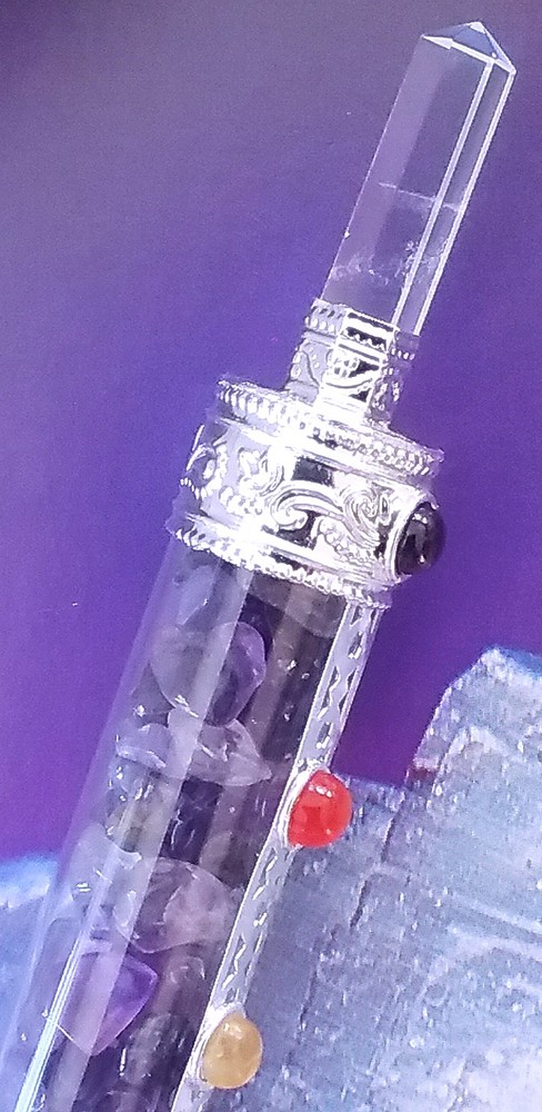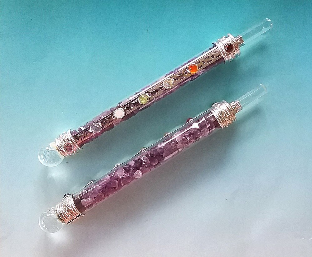 AMETHYST WAND, AMETHYST CHAKRA WAND With QUARTZ POINT, CHAKRA WAND AMETHYST WAND, AMETHYST CHAKRA WAND With QUARTZ POINT, CHAKRA WAND A beautiful very large 6.5-6.75 inch AMETHYST CRYSTAL wand that has 7 semi-precious chakra stones mounted on the front that include Garnet, Carnelian, Citrine, Peridot, Rainbow Moonstone, Iolite and Amethyst. There is a 6 sided crystal Quartz point at one end and a round crystal orb at the other end. The wand itself is a glass tube with crystal quartz chips inside. ABOUT AMETHYST CRYSTAL Amethyst is a stone of the mind. It helps to bring calmness and clarity. Wear Amethyst if you want to get in touch with your intuition, your feelings, or your values. Amethyst helps one learn of all things spiritual, mystic and psychic. Amethyst connects the physical plane with the higher realms, pulling the high frequency vibrations into the Crown Chakra, through the Third Eye, for processing by the rest of the chakras. Many work with Amethyst for it's protective bubble of light that is activated when one holds or wears this stone. Working with Amethyst to clear the Crown Chakra can create a sense of completeness and belonging, setting the stage for future development. Listing and template services provided by inkFrog