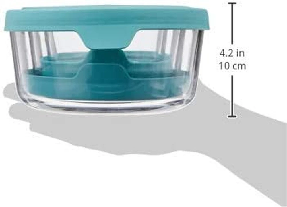 Description INCLUDES: This Anchor Hocking glass storage set contains (1) 2-cup, (1) 4-cup, (1) 7-cup round food storage containers with airtight mineral blue TrueSeal lids. DURABLE: This glass food storage container set is microwave, pre-heated oven, refrigerator, freezer, and dishwasher safe; airtight lids are BPA Free and top rack dishwasher safe. SAFE: Anchor Hocking glass is healthier than plastic and metal. It will not warp, stain, retain smells, or leach dangerous chemicals into food or drinks. FIVE-YEAR : Backed by a protective limited five-year , these glass meal prep containers promise to impress for many years to come. Glass is pre-heated oven safe up to 425 degrees F. Our tempered tough glass is also microwave, freezer, and dishwasher safe, and is up to 100% stronger than regular glass. True seal a glass food storage containers help protect the flavor of food and will not stain or absorb odor - they are also stackable and nestable for easy storage. True seal a lids are designed to prevent spills and leaks, and lock air out while sealing freshness in. Anchor Hocking glass is made in USA.