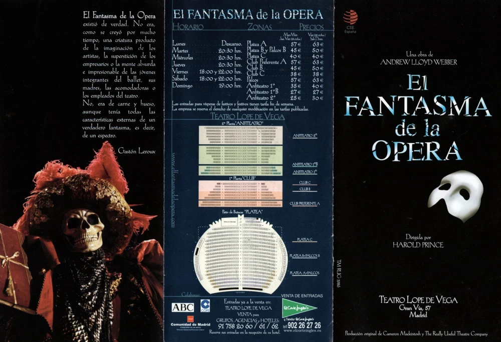 This is a rare six panel advertising herald (flyer) promoting the Original Spanish production of the landmark ANDREW LLOYD WEBBER musical "EL FANTASMA DE LA OPERA" ("The Phantom of the Opera") at Teatro Lope de Vega in Madrid, Spain. (The production opened September 4th, 2002 and ran for more than 21 months, closing June 21st, 2004.) ..... The production starred JUAN CARLOS BARONA in the title role, JULIA MOLLER as "Christine Daae" and ZENON RECALDE as "Raoul" ..... Side note: On January 9th, 2006, The Phantom of the Opera became the longest-running musical in Broadway history, surpassing the previous record held by Cats . The Phantom of the Opera was the winner of seven 1988 Tony Awards including "Best Musical" ..... BROADWAY CREDITS: Music by ANDREW LLOYD WEBBER ("Jesus Christ Superstar", "Evita", "Cats", "Joseph and the Amazing Technicolor Dreamcoat", "Song and Dance", "Starlight Express", "The Phantom of the Opera", "Aspects of Love", "By Jeeves", "Sunset Boulevard"); Book by ANDREW LLOYD WEBBER and RICHARD STILGOE based on the novel by GASTON LEROUX; Lyrics by CHARLES HART; Additional Lyrics by RICHARD STILGOE; Sets and Costumes designed by MARIA BJORNSON; Choreographed by GILLIAN LYNNE; Directed by HAROLD PRINCE; Produced by CAMERON MACKINTOSH and THE REALLY USEFUL THEATRE COMPANY ..... DETAILS: Advertising handbills and heralds were often distributed or inserted into the playbills of other productions to help generate ticket sales for upcoming shows and events. The six panel, bi-fold flyer measures 4 1/4" X 8 3/4" inches (approx. 12 1/2" X 8 3/4" inches when opened) and includes wonderful graphics, five full color production photos, promotional text (most text in Spanish), ticket prices, theater seating plan and booking information ..... CONDITION: With the exception of light edge wear, this flyer is in excellent condition and will make a wonderful addition to the collection of any musical theatre aficionado or historian. This item will be carefully packaged in a protective, carded sleeve and backed by stiff cardboard.