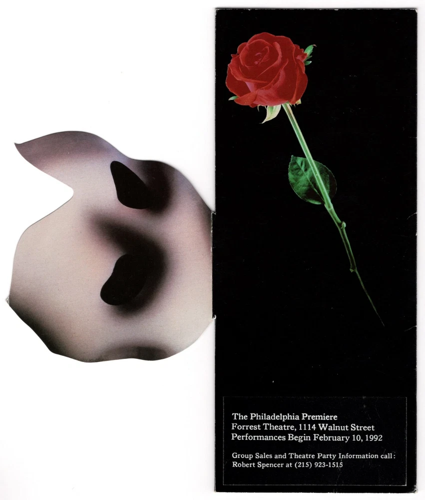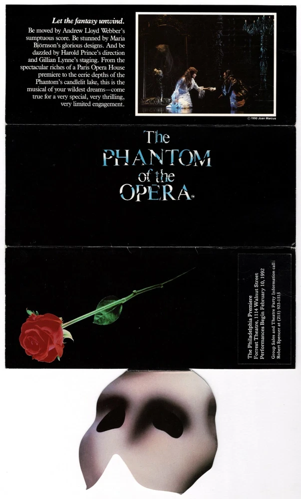 This is a rare die-cut advertising herald (flyer) promoting group sales for the Philadelphia Premiere engagement of the landmark ANDREW LLOYD WEBBER musical "THE PHANTOM OF THE OPERA" at the Forrest Theatre in Philadelphia, Pennsylvania beginning February 10th, 1992. ( The Original Broadway production opened January 26th, 1988 at New York's Majestic Theatre and has announced a February 18th, 2023 closing after 13,765 performances. It is, by over 3,500 performances, the longest-running show in Broadway history . This tour opened May 22nd, 1990 at the Auditorium Theatre in Chicago and ran for more than eight years, closing November 15th, 1998 at the Pantages Theatre in Los Angeles . ) ..... The musical starred KEVIN GRAY in the title role, TERI BIBB as "Christine Daae" and KEITH BUTERBAUGH as "Raoul" and featured RICK HILSABECK, DAVID HUNERYAGER, PATRICIA HURD, OLGA TALYN, DONN COOK and PATRICIA WARD with SARAH PFISTERER playing the role of "Christine Daae" at certain performances ..... Side Note: On January 9th, 2006, The Phantom of the Opera became the longest-running musical in Broadway history, surpassing the previous record held by Cats . The Phantom of the Opera was honored with seven 1988 Tony Awards including "Best Musical" ..... CREDITS: Music by ANDREW LLOYD WEBBER ("Jesus Christ Superstar", "Evita", "Cats", "Joseph and the Amazing Technicolor Dreamcoat", "Song and Dance", "Starlight Express", "The Phantom of the Opera", "Aspects of Love", "Jeeves", "Sunset Boulevard", "School of Rock"); Book by ANDREW LLOYD WEBBER and RICHARD STILGOE based on the novel by GASTON LEROUX; Lyrics by CHARLES HART; Additional Lyrics by RICHARD STILGOE; Sets and Costumes designed by MARIA BJORNSON; Choreographed by GILLIAN LYNNE; Directed by HAROLD PRINCE; Produced by CAMERON MACKINTOSH and THE REALLY USEFUL THEATRE COMPANY ..... DETAILS: This rare die-cut, eight panel flyer measures approx. 9 1/8" X 3 7/8" inches (9 1/8" X 15 1/4" inches when opened), is printed on a glossy card stock and includes wonderful graphics, full color photography, promotional text, production credits and booking information ..... CONDITION: With the exception of moderate edge wear, this rare flyer is in excellent condition and will make a wonderful addition to the collection of any musical theatre aficionado or historian. This item will be carefully packaged in a protective, carded sleeve and backed by stiff cardboard.
