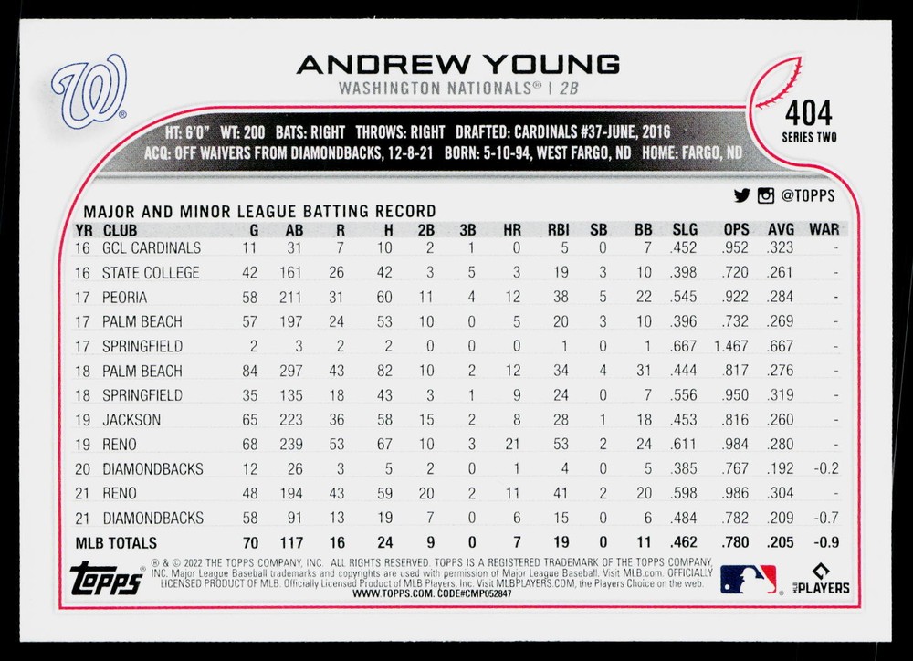 You will receive a , Andrew Young 2022 Topps #404 Washington Nationals Near Mint or Better condition. Please note i am not a professional card grader the condition of raw cards can be very subjective. Please refer to the high quality pictures to determine condition yourself any questions at all please feel free to ask!! we take pride in the quality of cards we sell and ship, all cards will be shipped in a penny sleeve and top loader for added protection. be sure to save us as a seller, as we are growing and listing daily THANK YOU FOR YOUR BUSINESS