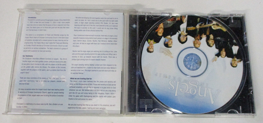 CD Details: Angels In Worship Impact Music Team of Christian Community Church Song Titles - see photo CD is good CD insert is good Crystal case is good, moderate wear Buyer to pay postage where indicated. Please contact me prior to bidding if you require further information.