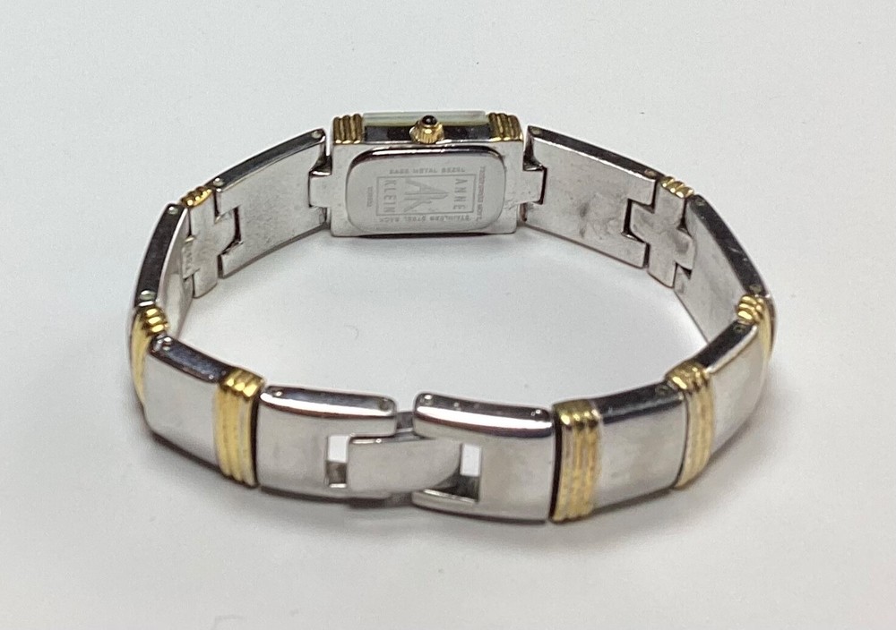 This beautiful Anne Klein wristwatch is a stunning addition to any outfit. With a quartz movement and a 12-hour dial, it is both functional and stylish. The bangle band is comfortable to wear and fits wrists between 5.76-6 inches (146.3-152.4 mm). The case is made of silver and gold, giving it a luxurious look. This wristwatch is perfect for formal occasions and comes with a snap caseback. It does not come with papers, an original box/packaging, or a manual/booklet. The seller does not provide a warranty or guarantee. It is a stunning piece that will make any outfit stand out. 1144
