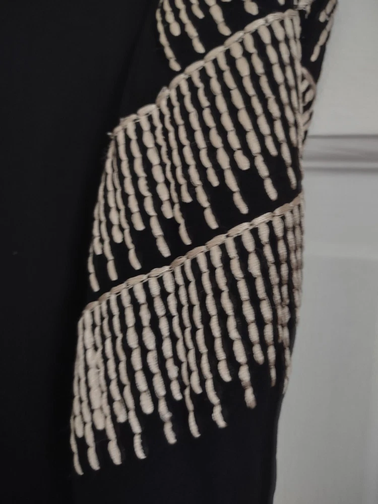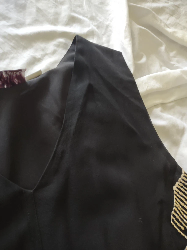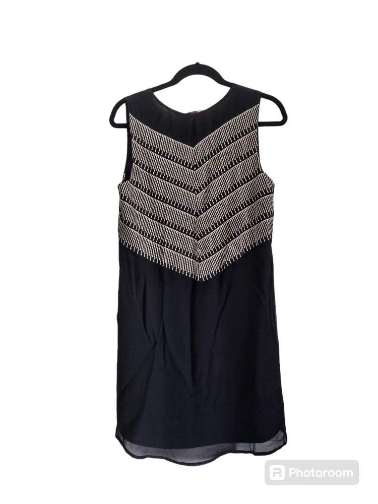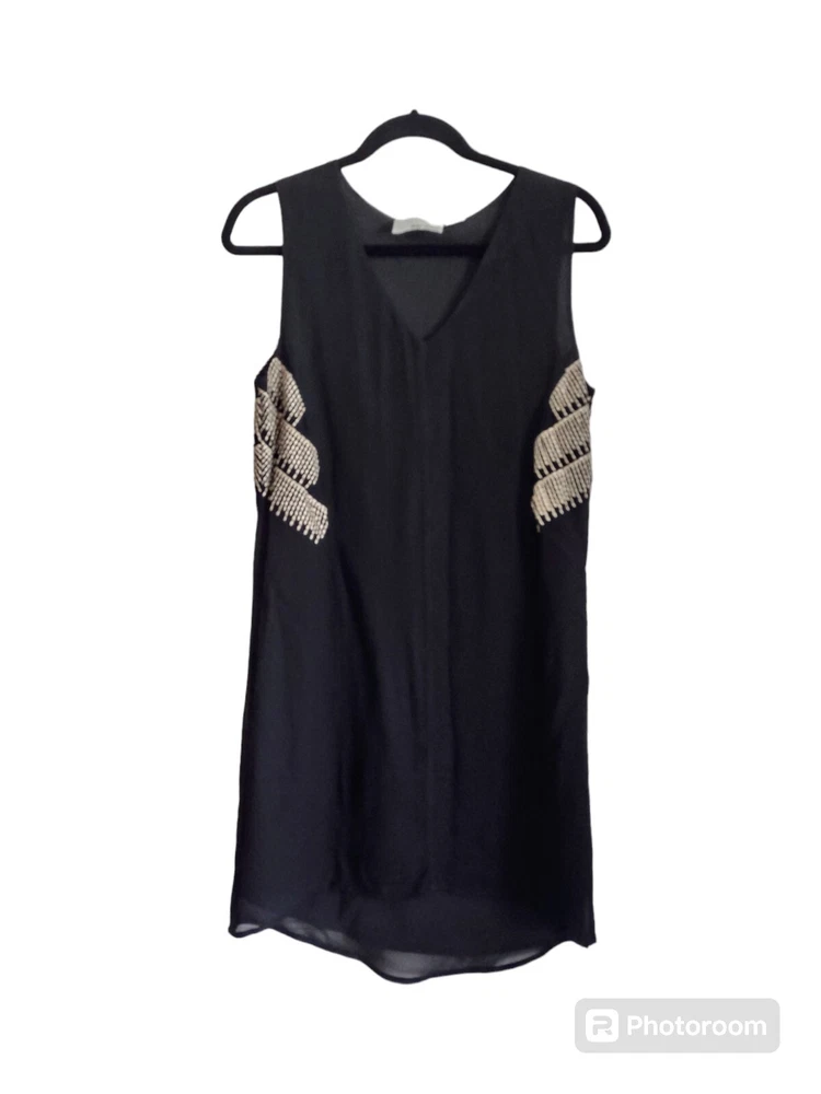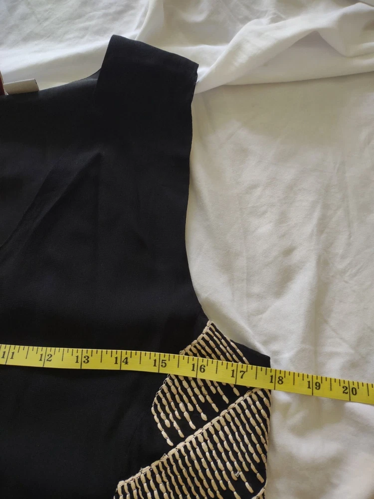 Anthropologie By Chloe Oliver Women's Black Sleeveless Embroidered Dress Small Embroidered with gold on the sides and in the back Measurements in pics are pit to pit and full length **In certain lighting it shows the tiniest bit of wear on the side of the neckline as you may be able to see in the last picture but it is barely noticeable at all. Fully lined Minimal high low hem