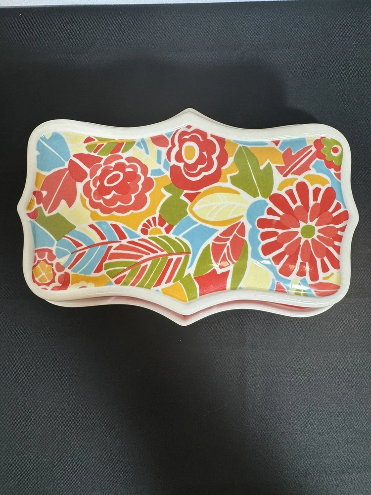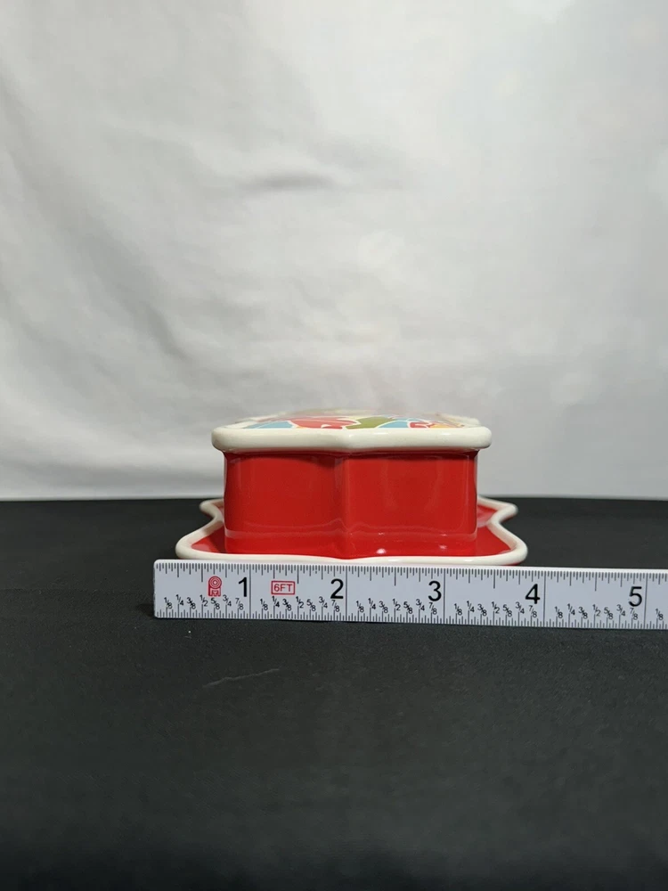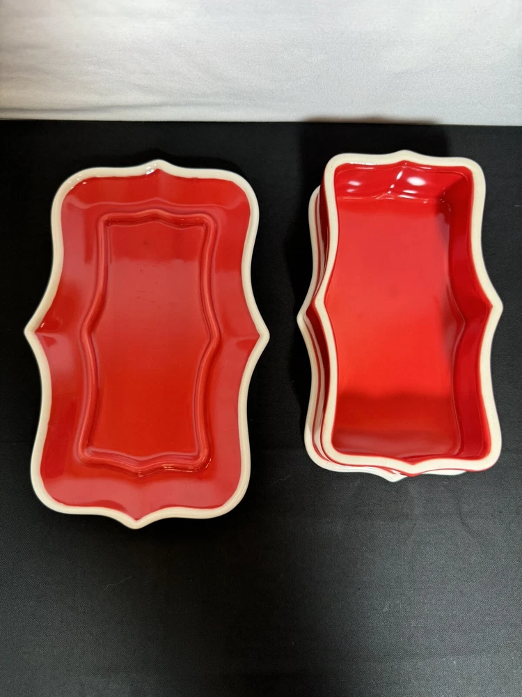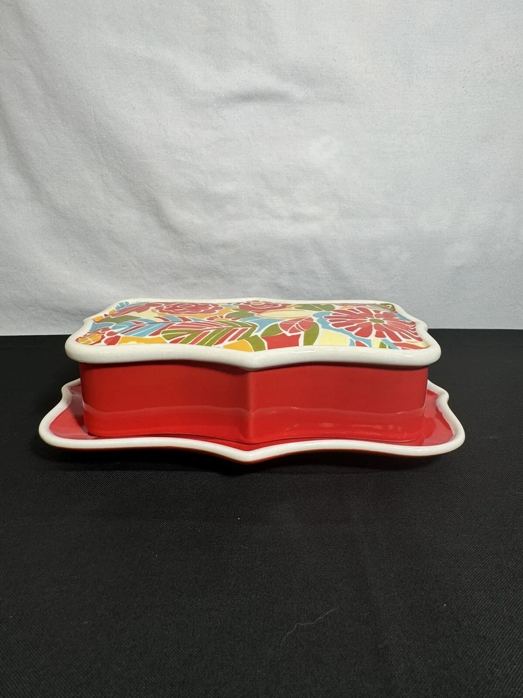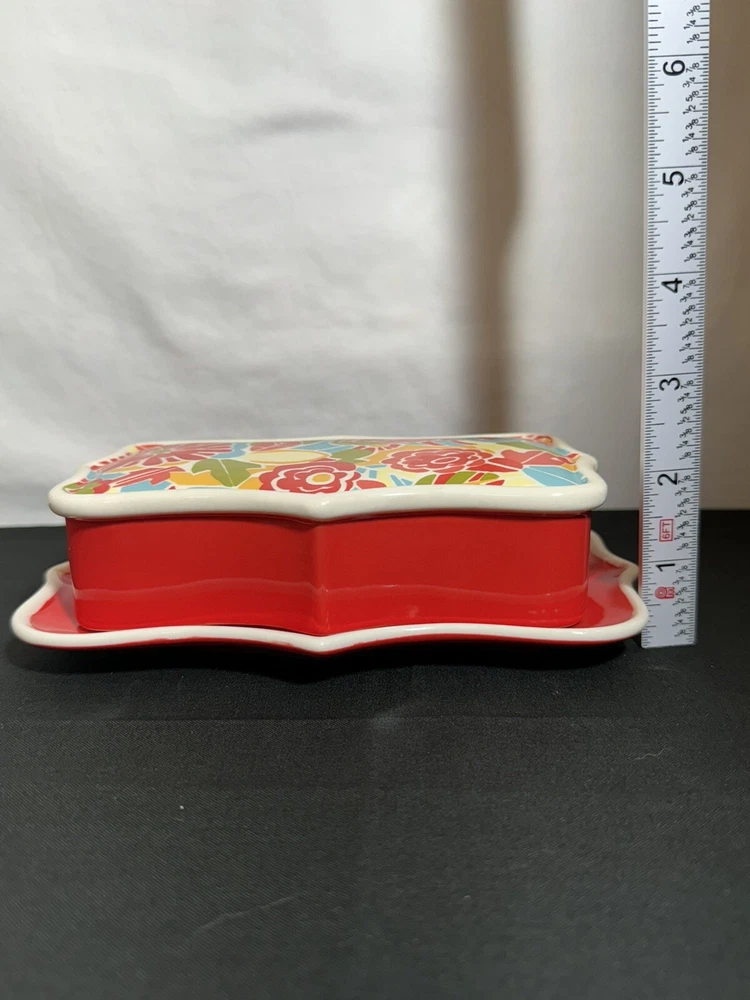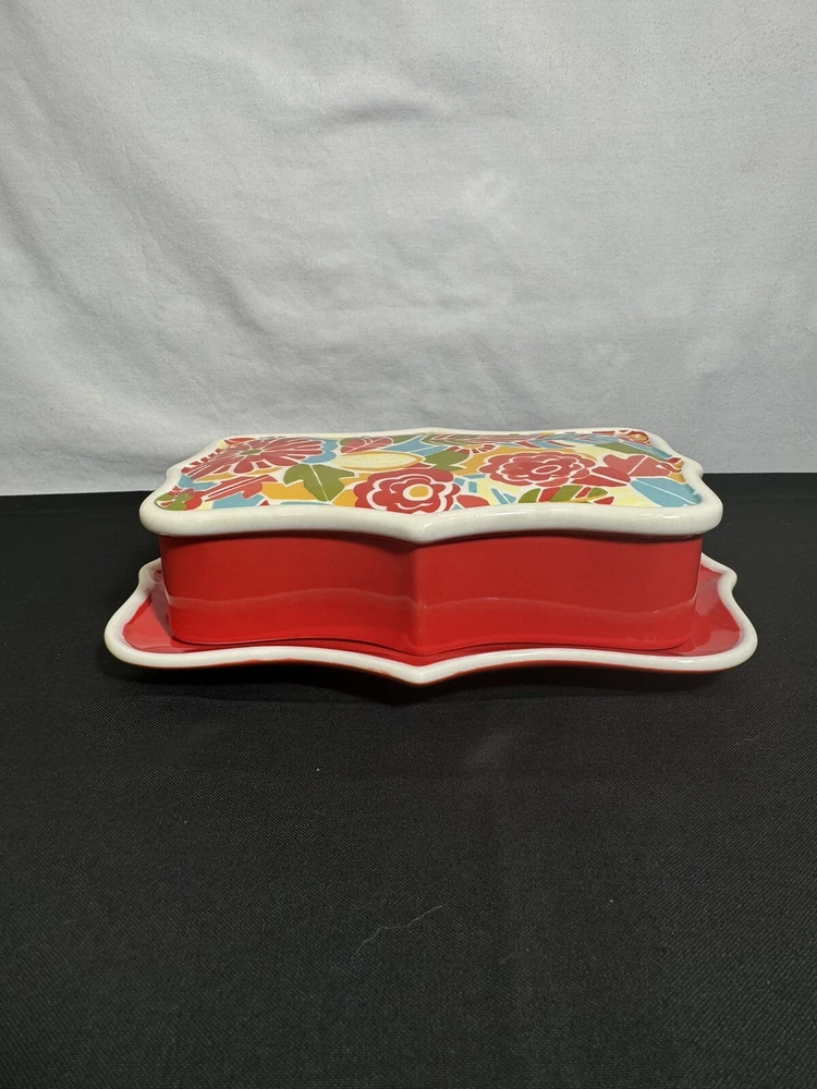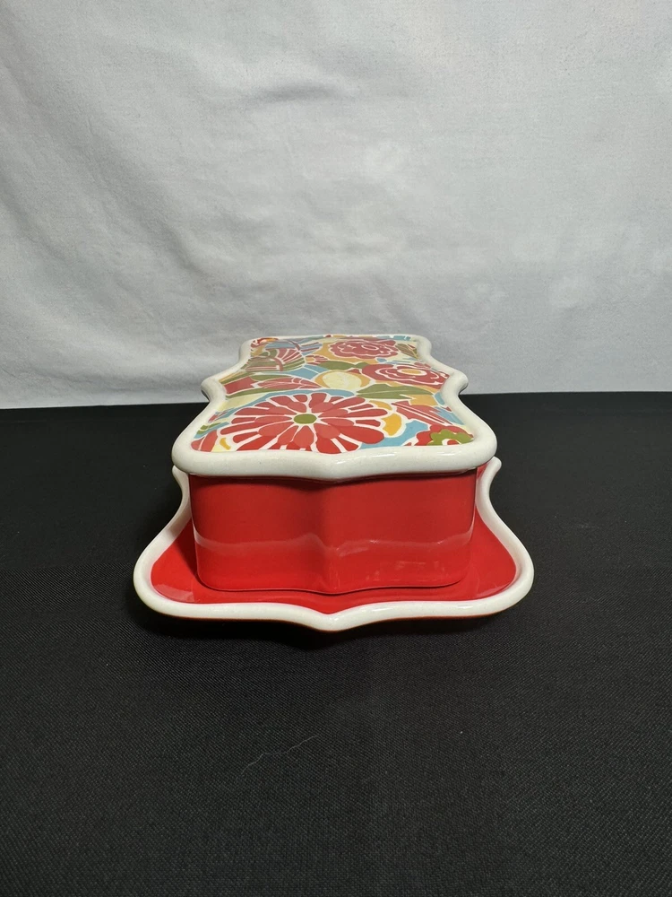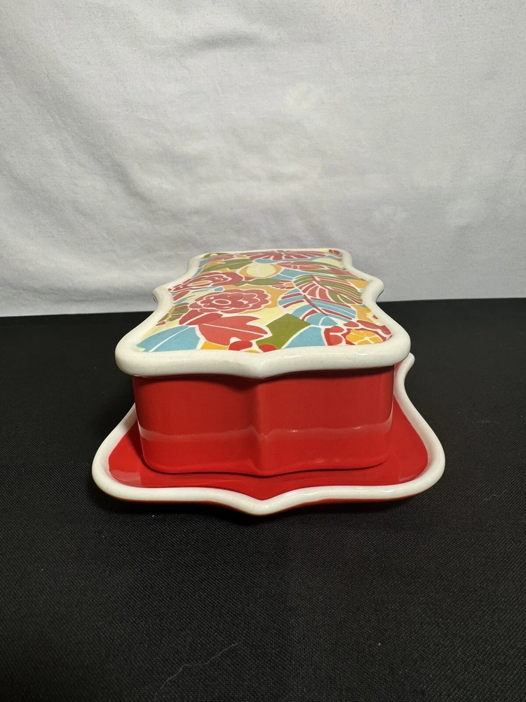 Add a touch of elegance to your kitchen with this beautiful covered butter dish from Anthropologie. The dish features a red floral pattern that will brighten up any table setting. The glossy finish on the ceramic material makes it easy to clean and maintain. This covered dish is perfect for keeping your butter fresh and presentable. It is not part of a custom bundle and is the ideal addition to your dinnerware collection. Use it for special occasions or everyday use, and impress your guests with its stylish design.