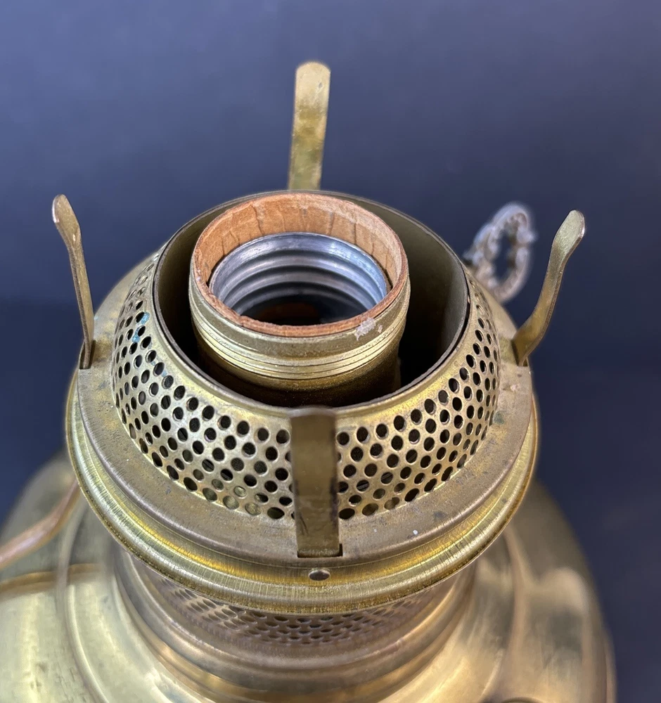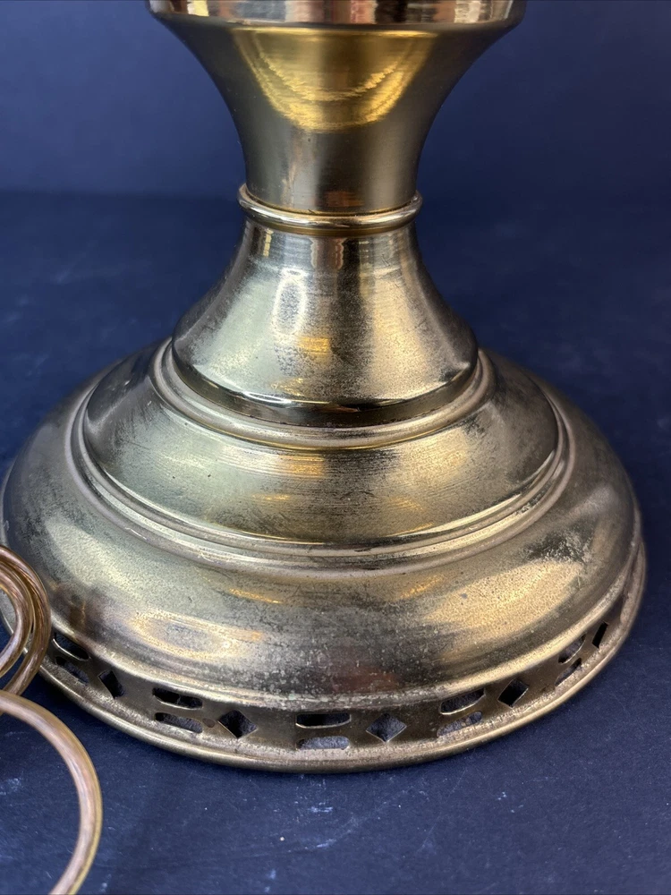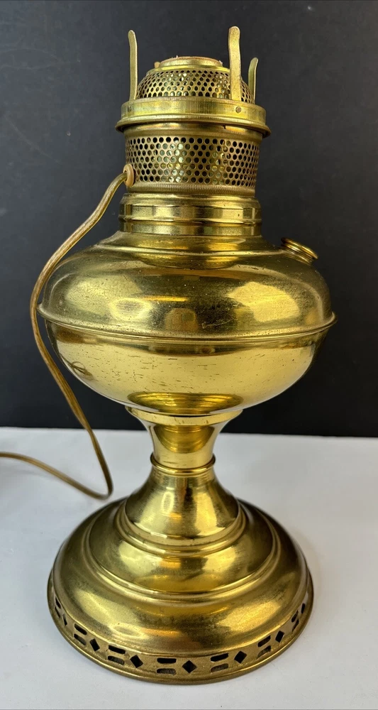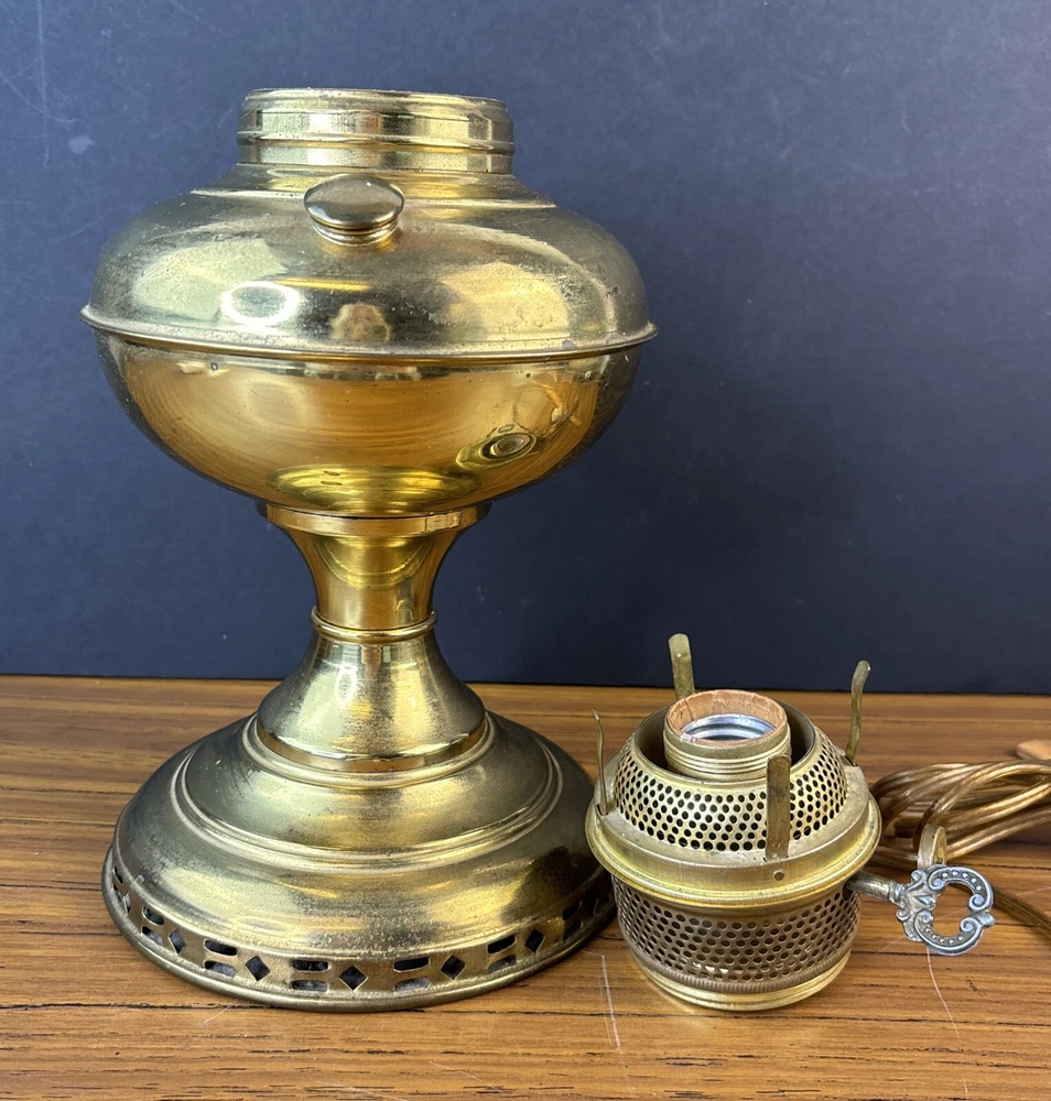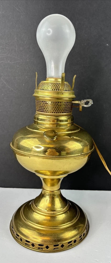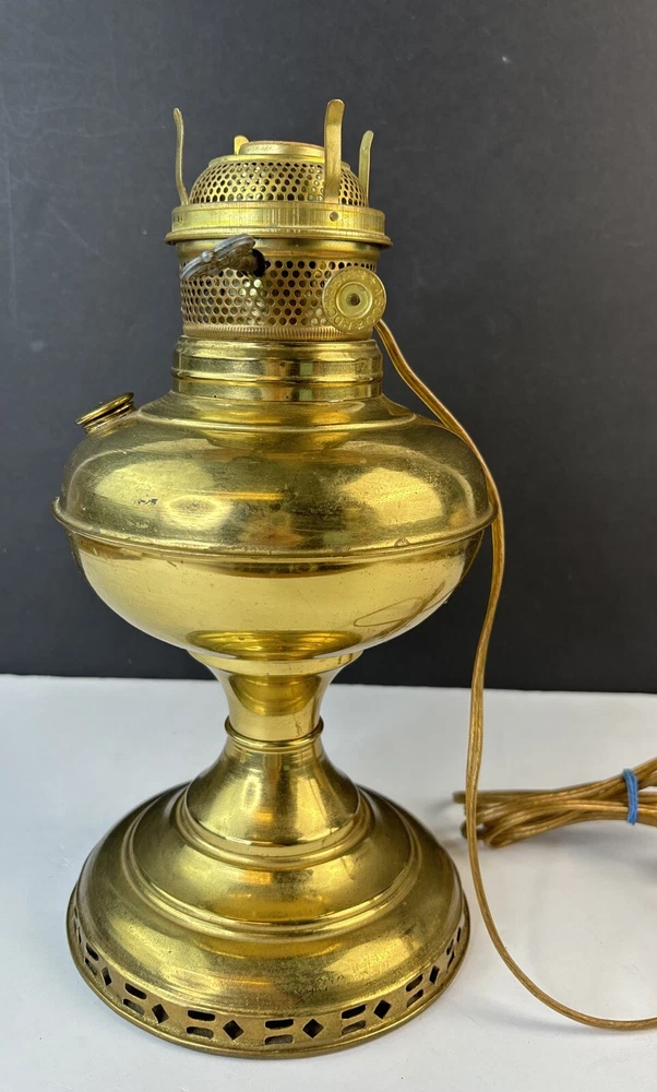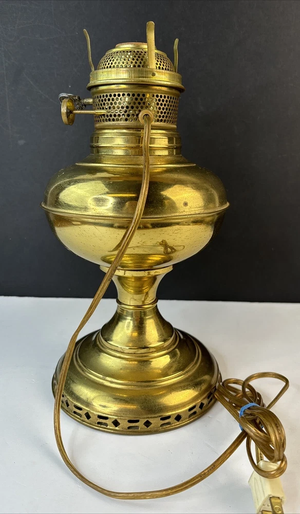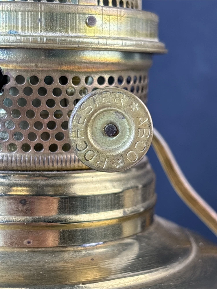 Antique Vintage ABCO Rochester Oil Kero Lamp converted to Electric Natural aged patina, light surface scratches/scuffs. I find no dings or dents. Cord looks good and I see no exposed wires. Measures 12" tall. Weighs 1 pounds 13 ounces (prior to packaging) Lightbulb is not included in sale. We buy most of our pieces at auctions & Flea markets, so we may not know the history of the item. We are not antique dealers, collectors or experts. We describe the item along with any flaws and markings we can find the best we can. We will combine shipping whenever possible and ask that payment be made within 4 days. If you are not completely satisfied, please contact us prior to opening a claim with eBay and we will be happy to work with you. Thanks for looking!!