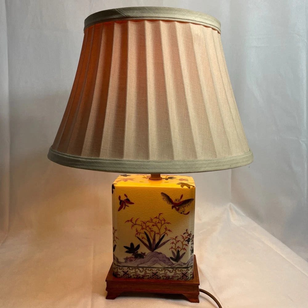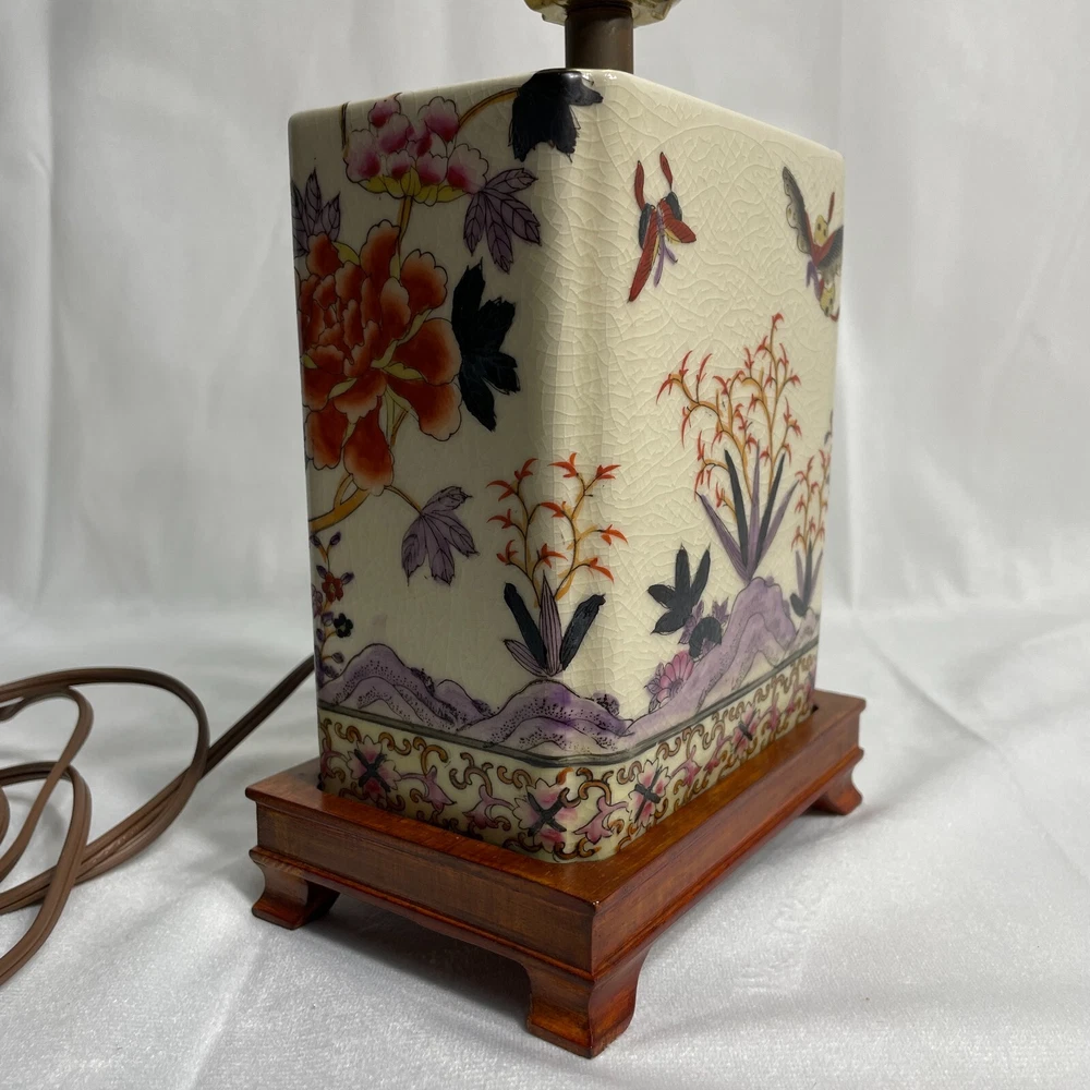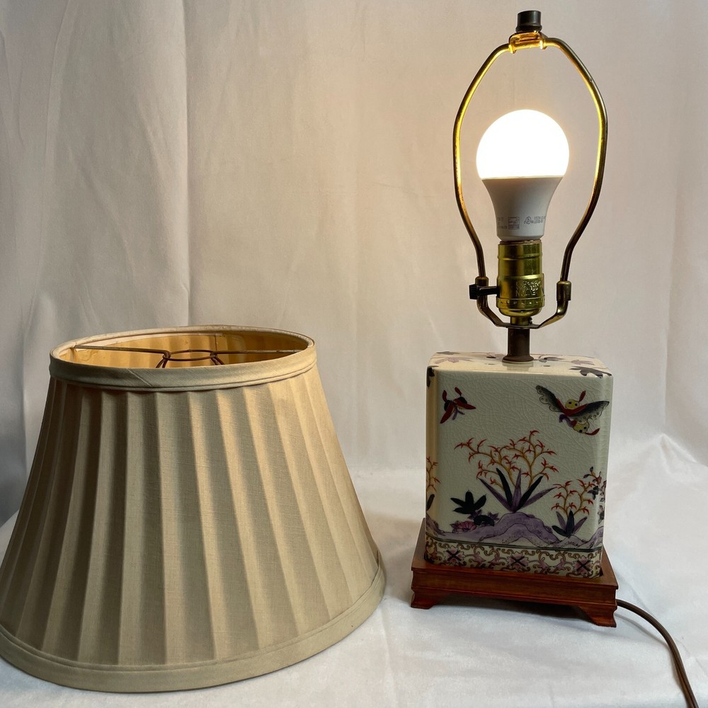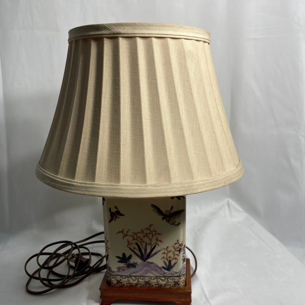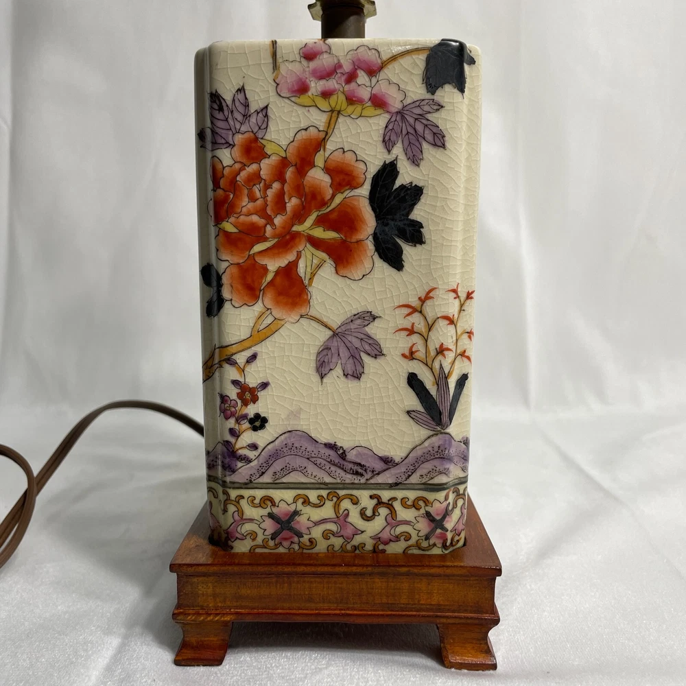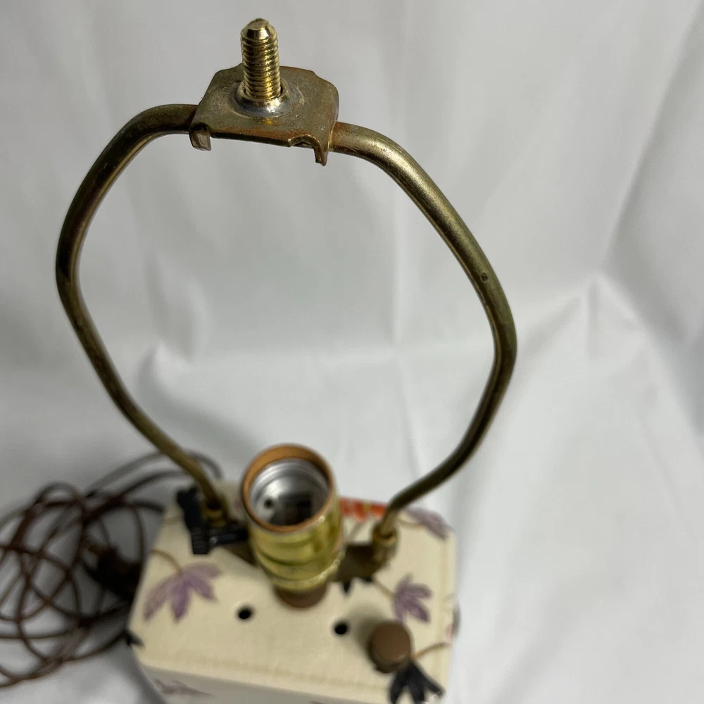 This Antique Porcelain Lamp from the 1940s features a beautiful Multi Color Floral Design on a Wood Base. The lamp has a Shaded design with a Bell-shaped Lamp Shade included. It is a vintage piece with a 1940's style and an Original design. The lamp has a Corded Electric Power Source with Knob Control and a 3-light Switch option for easy operation. Standing at 17 inches high, this Lady Lamp exudes a classic Art and Floral theme, making it a unique addition to any Unisex Adults' living space. Lamp Dimension: H 17" W 5 3/4" L 4" Cord Length: 8 ft Lamp Shad: H 8" Top Diam 8" Bottom Diam 12"