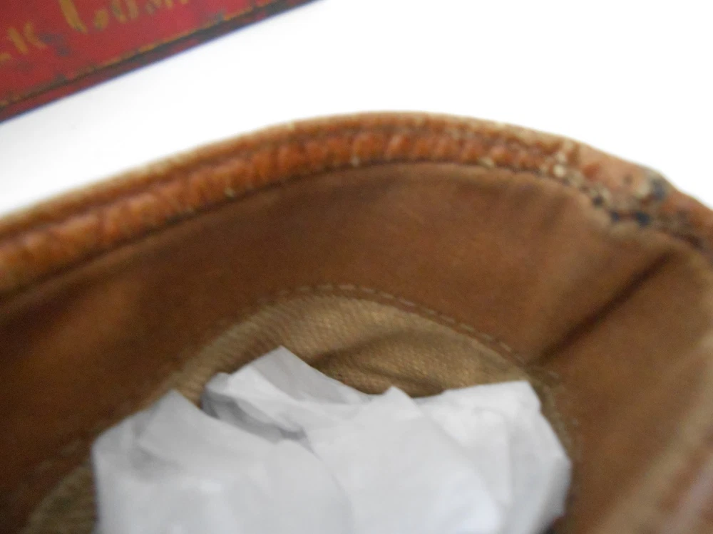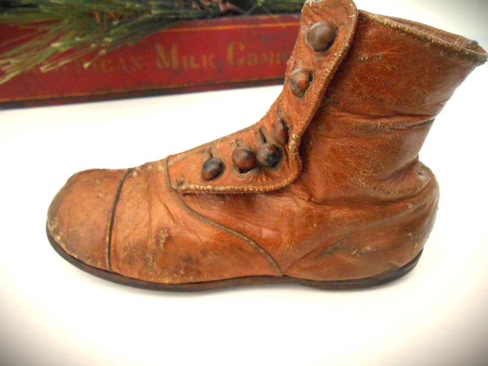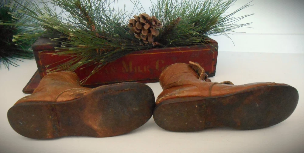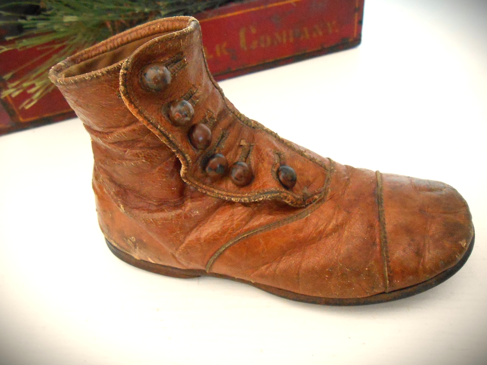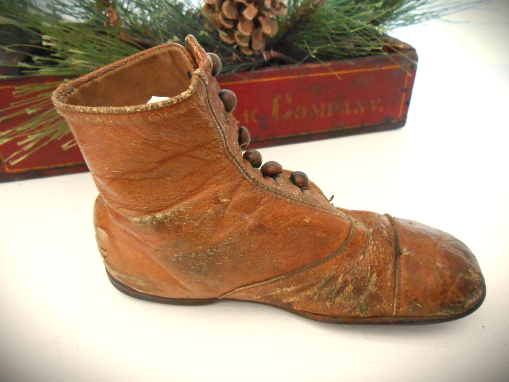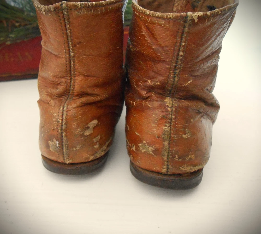 Antique Camel Leather Child's Shoes; 6 Buttons; Scalloped Closure; Up for your consideration are these darling camel leather Victorian Era child's shoes. There are 6 buttons on each shoe. The buttons show some age wear (look at pictures). This young boy or girl got a lot of wear out of these shoes - evidenced by tiny scuffs (see pictures). I don't know if all the buttons are original - a few look a tiny bit smaller (?).These shoes measure 6 inches in length, 2.1 in width (at the widest point and 4 inches in height. There a small heel that is nailed onto the shoe. There is also a rim around the inside top edge that looks like it may be a dark camel colored grosgrain (?) (see close-up). These would be great in a display of shoes, dolls, bears, primitives, country, cottage-core, etc. (As always, IF you are interested in a best offer option, you can message me.) I try to describe all of my items to the best of my ability; all of my items are sold AS-IS . Please take the time to look at all the pictures closely and ASK any questions you might have. The pictures serve as part of the description. I sell antiques; they have a history. Also note the 24-hour turn-around if payment is received promptly. Note: you are paying the actual shipping costs - I don't charge anything extra. Thank you. AA = Antique Americana