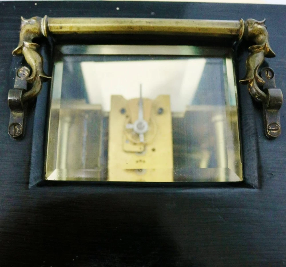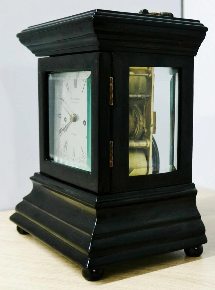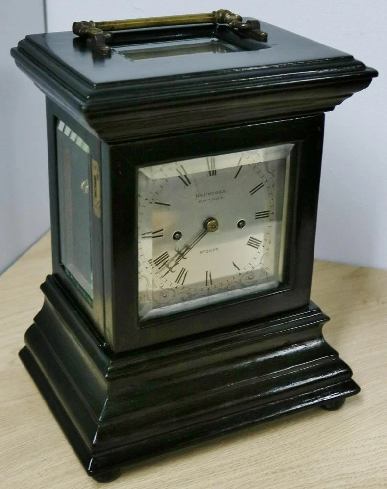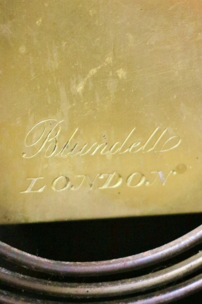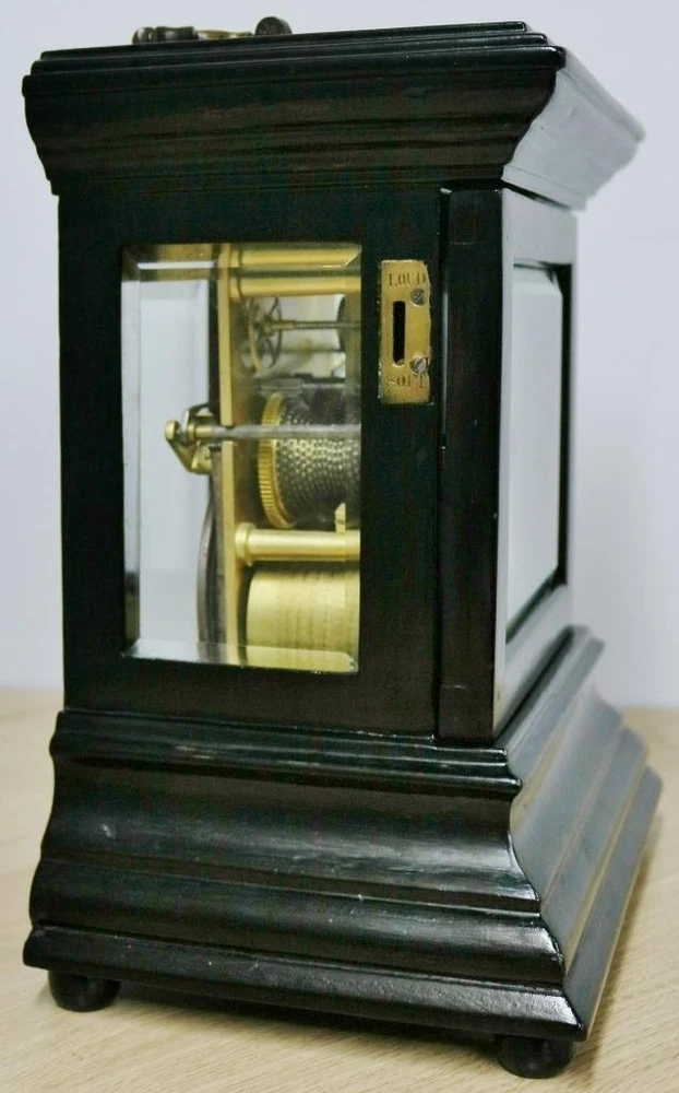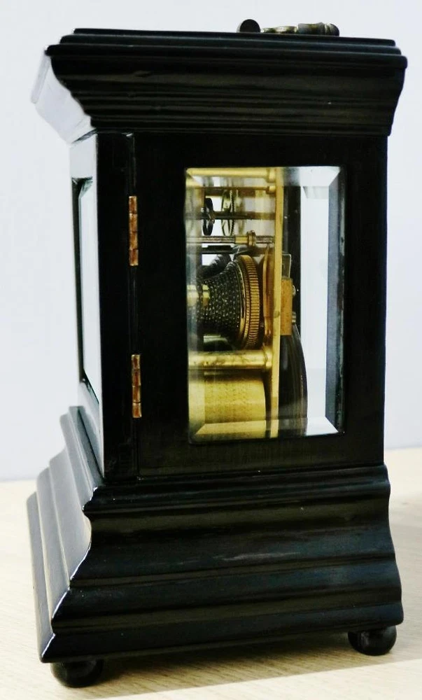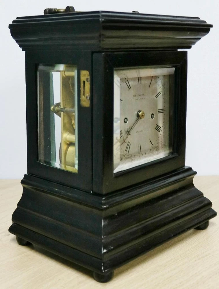 Description Beautiful very rare twin fusee library bracket clock with stunning patina and colour to the wonderful ebonised finish The case is made of solid wood with this stunning patina ebonised finish which gives this absolutely amazing display finish The clock has a classic library clock design with the glass panels on all sides and top with a hinged front and back door, all glass panes are thick bevelled edged panes and all in excellent condition Case is in excellent original condition for age and looks stunning on display with a good age patina Silvered dial with engraved spandrels to the corners, signed by the maker Blundell of London Serial No. 2687 who dates from the early -mid 19th century Engraved Roman numerals and original steel hands Dial is in excellent original condition and looks fantastic Rare English 8 day twin fusee gong striking movement with original platform escapement The movement strikes the bell the amount of hours on each hour Original platform escapement and a new brass winding key Extremely high quality has can be expected and is also signed by the maker Blundell of London Movement is in full working order keeping good time and striking as it should The clock has small proportions and measures 12 inches high x 8 inches wide x 6 inches deep Antique English 8 Day Ebonised Twin Fusee 5 Glass Library Bracket Carriage Clock Antique English 8 Day Ebonised Twin Fusee 5 Glass Library Bracket Carriage Clock Description Main reasons why you should purchase your antique clock from Times & Chimes Ltd !!! We understand buying an antique clock is a big decision and we are very well experienced in current market's as well as fully trained and experienced horologists. We have many years experience in buying and selling original antique clocks which are carefully sourced and many from private collections and we know exactly what buyers expect when purchasing such a prized possession and a future investment. Here are some of the main reasons why you should buy your antique clocks from us for complete piece of mind 1 - We offer the very best customer service before, during and after the sale 2 - Fully trained and hugely experienced horologists 3 - Six month return to base warranty on mechanisms 4 - All our original antique clocks are of high quality and carefully sourced 5 - Every clock we sell are tested for a minimum of 1 week before being offered for sale 6 - We have earned a consistently excellent track record of sales with 100% Feedback 7 - All our items are professionally packed and dispatched promptly 8 - All clocks are sent with world leading couriers on a priority service with full online tracking PLEASE NOTE: I have just received some excellent quality bracket clocks from a private collection all of which have been well looked after all of which will be listed over the next few weeks. Some excellent quality bracket clocks please keep your eyes open over the next few months Description Beautiful very rare twin fusee library bracket clock with stunning patina and colour to the wonderful ebonised finish The case is made of solid wood with this stunning patina ebonised finish which gives this absolutely amazing display finish The clock has a classic library clock design with the glass panels on all sides and top with a hinged front and back door, all glass panes are thick bevelled edged panes and all in excellent condition Case is in excellent original condition for age and looks stunning on display with a good age patina Silvered dial with engraved spandrels to the corners, signed by the maker Blundell of London Serial No. 2687 who dates from the early -mid 19th century Engraved Roman numerals and original steel hands Dial is in excellent original condition and looks fantastic Rare English 8 day twin fusee gong striking movement with original platform escapement The movement strikes the bell the amount of hours on each hour Original platform escapement and a new brass winding key Extremely high quality has can be expected and movement is also signed by the maker Blundell of London Movement is in full working order keeping good time and striking as it should The clock has great proportions and measures 12 inches high x 8 inches wide x 6 inches deep Summary This is a perfect investment clock and a beautiful display piece. Looks absolutely fantastic wherever it is displayed and a true talking point of any room. Exceptional clock which will only grow in value and one of the best ones i have ever had the pleasure to offer for sale and you wont find one quite like this for a while Important Please Read: ALL antique clocks after transport no matter how well they have been looked after or serviced may require setting up, adjustments and setting into beat when you receive them and i always recommend a professional or an experienced clock person to do this correctly for you. Unfortunately with some clocks it is not a matter of unpacking them, putting the pendulum on and away they go, some clocks will need the extra adjustments and setting into beat so please remember you may require a professional for initial setup before bidding. Most clocks will be ok and will not need any additional adjustments but please bear in mind this may not be the case. Any clocks returned because of setting up issues or adjustments needed after transit then a fee will be applicable. For your piece of mind we test all our clocks here before they are sent out and any issues are either sorted or described in the add, the clock will not have any problems unless stated in the add as they are tested vigorously before sending. Please read my full terms and conditions by clicking on the returns tab above. Good luck and happy bidding Click images to enlarge Payment PayPal Cheque Bank Transfer Cash on collection You are more than welcome to personally collect any item free of charge Shipping All my items will be packed professionally Shipping prices include professional packaging materials, boxes, and priority ser